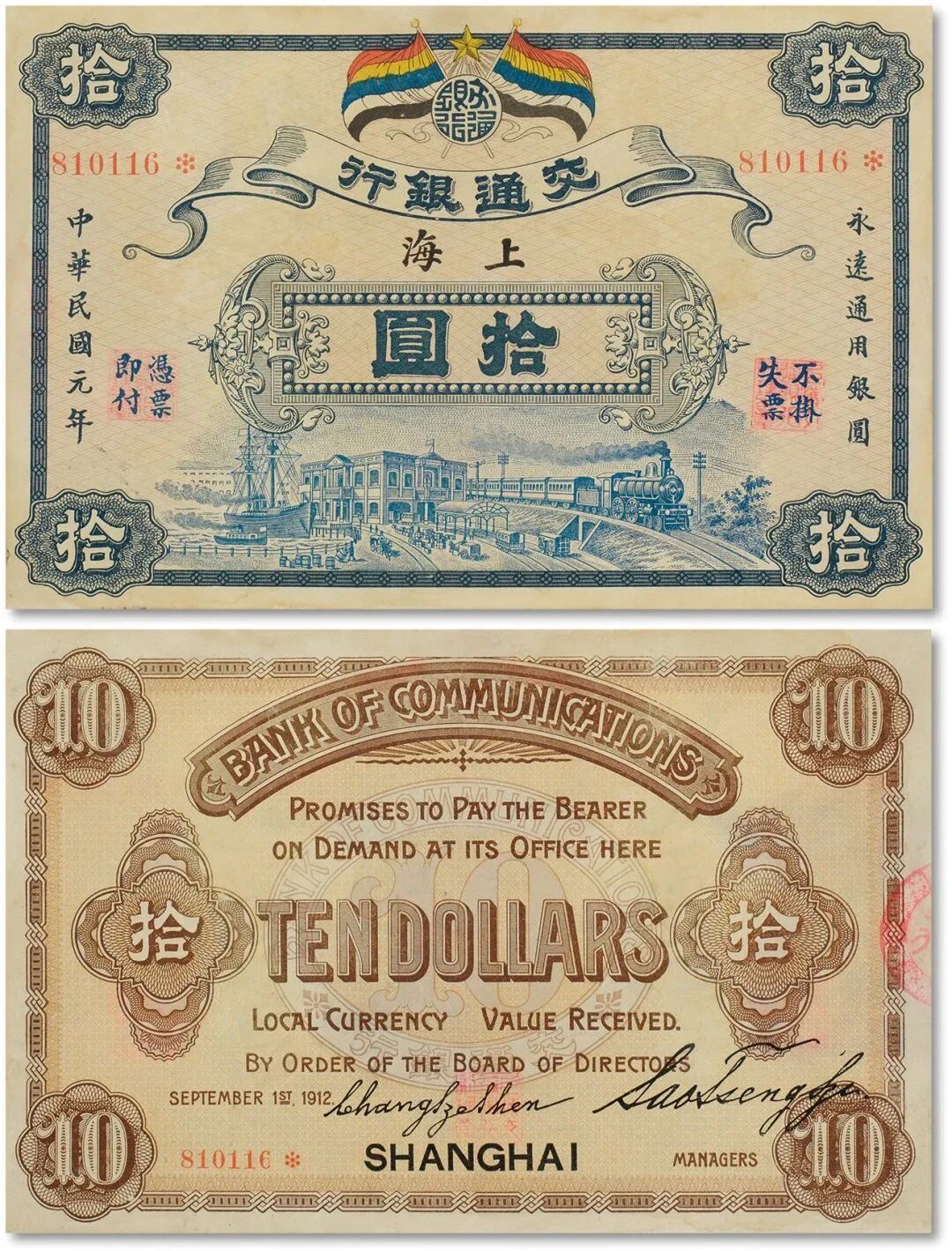 民国元年(1912年)交通银行五色旗版拾圆
