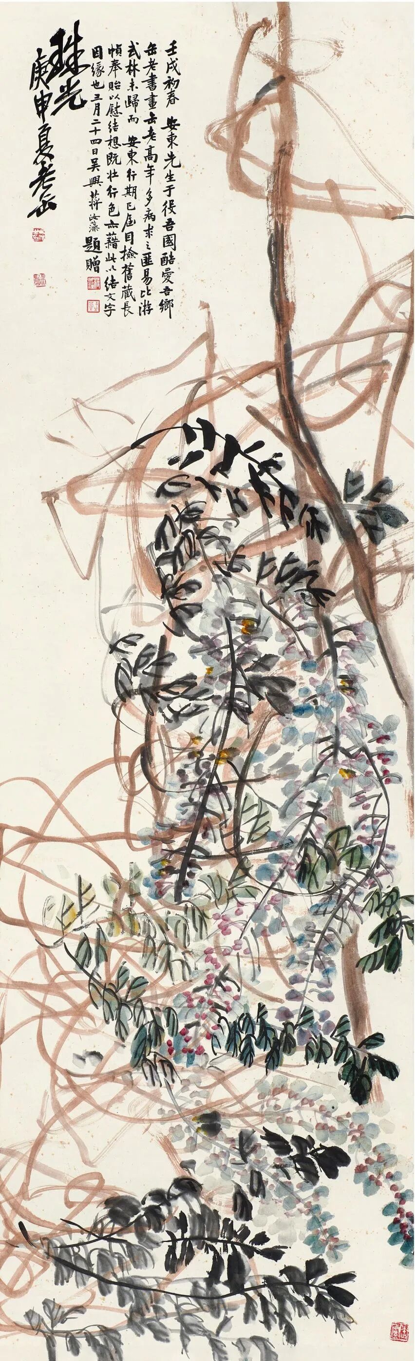 此图作于1922年冬,时年缶老79岁,正是其艺术创作高峰时期。画面右侧画几根遒劲盘绕的藤枝,花叶疏密错落分布其间。吴昌硕深厚的金石、书法功底,使其落笔便自不凡,先以中锋运草篆之法写盘藤,复以淡墨花青点叶,浓墨勾叶脉,藤叶间散落数串淡雅的藤花。满幅笔墨飞动,用笔之收放、行止、方圆、正侧,无不合乎气韵,充分体现了缶老浑厚苍茫的美学观。布局章法亦颇费经营,藤条屈曲盘旋,错落穿插,似断若连,密处愈密,叶不透风,而疏处愈疏,潇洒自如。此图尺幅巨大,挥洒自如,是缶老硕藤本科植物绘画题材中极具代表性的佳作。