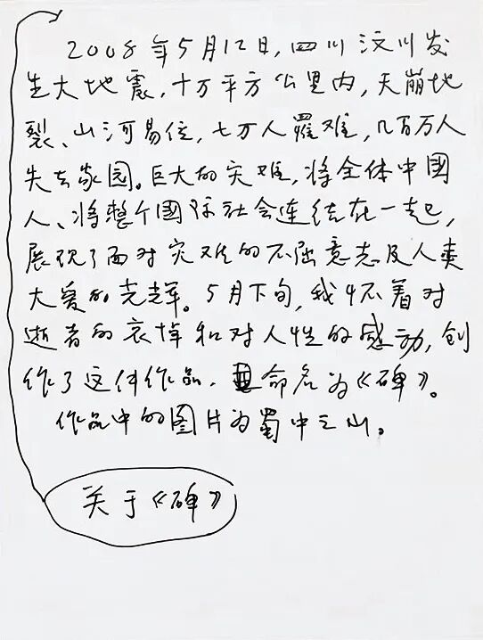 2008年5月12日,四川省汶川发生大地震,十万平方公里内天崩地裂,大地震颤,山河易位,满目疮痍,七万人罹难,几百万人失去家园,举国同悲。怀着对逝者的哀悼和对人性的感动,尚扬创作了《碑》。