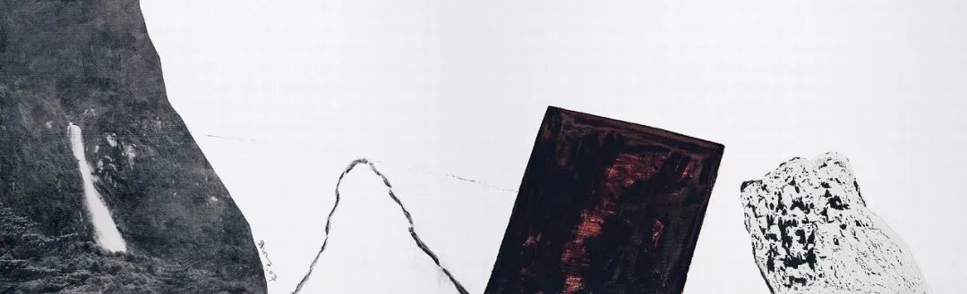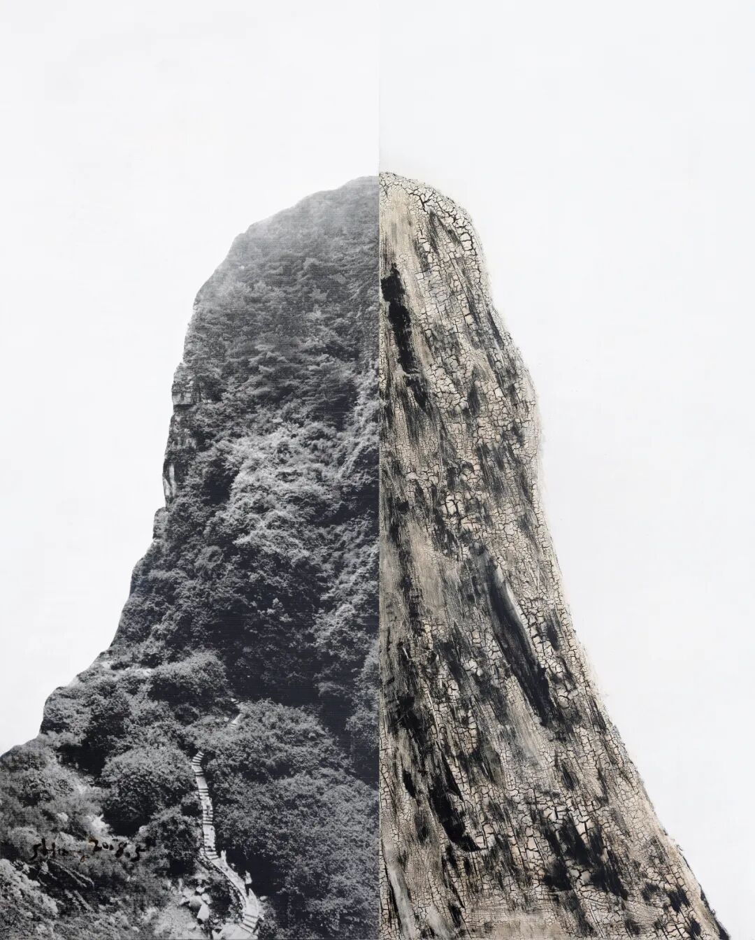 画面由左侧的摄影喷绘和右侧的传统技法皴擦描绘组成,摄影图片中的高山即为蜀中之山,右侧龟裂的笔触色块带来粗粝的物质感。糙杂的构成映射了现实的喧嚣,分裂的构图对应了美丽的天府之国遭受重创、山河呜咽的事实。尚扬的作品看似抽象,实则投射和隐喻了种种不言自明的感受,左右两种视觉的并置,如同当时的现实。