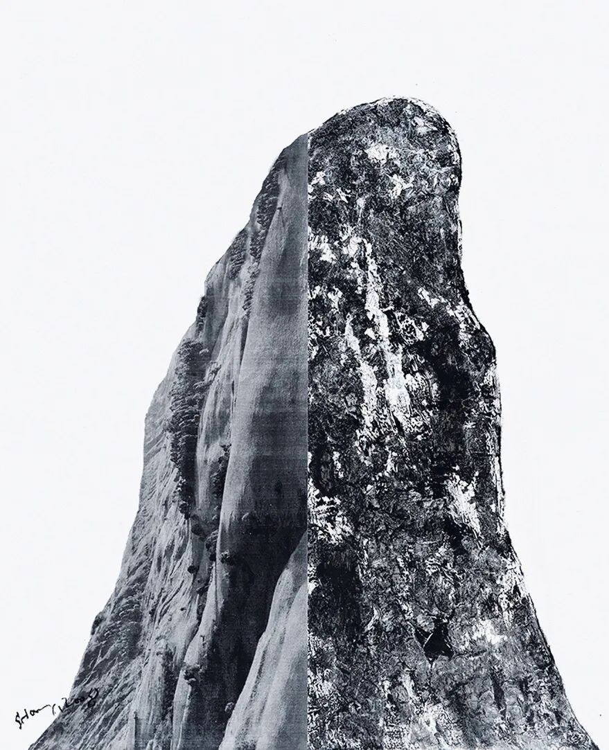 《碑》在尚扬的创作序列中属于跨越十年的重要系列“董其昌计划”。在尚扬艺术的成熟期,他借“董其昌”摹古之名回到中国传统山水画的余象记忆中,在山水中找寻绘画空间。2008年是“董其昌计划”系列的一个生长节点——搬入酒厂工作室后,创作空间体量的伸展使得画面的视域更加开阔。即便是小尺幅,也有着大风景。白色背景中以墨色呈现出一座高耸的孤峰,颇有五代时关仝“笔愈简而气愈壮,景愈少而意愈长”的意境。尚扬也确认,其2008年的创作不同于前期局部应用的山水一角就是想加大这种冲突。传统山水画中高远法构图的仰眺视角让山体如“碑”一般伟岸肃穆,而文化和自然现实的双重破裂则让这幅画具有纪念碑性,山石样貌的呈现转化为一种交错共存的多元景观,以其崇高的精神性摄人心魄。