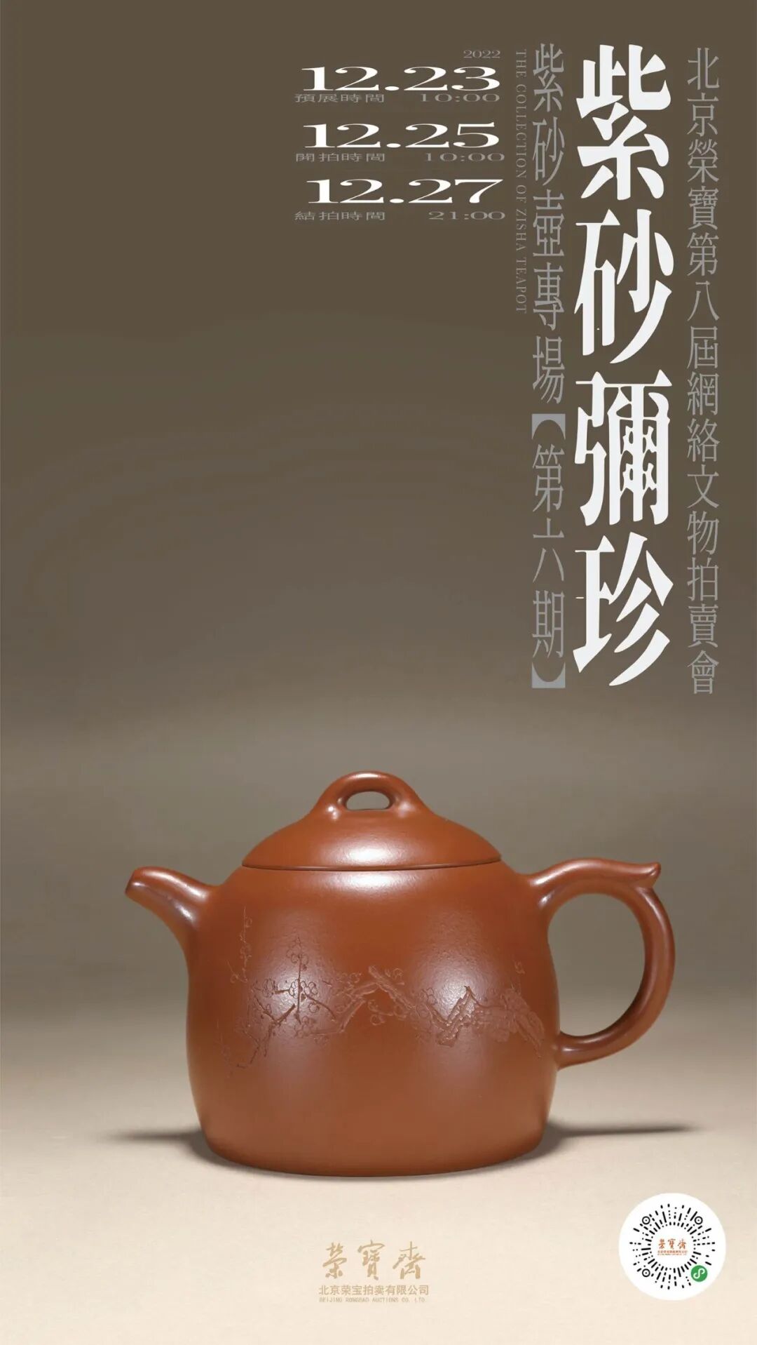 北京荣宝第八届网络文物拍卖会——紫砂弥珍紫砂壶专场(第六期)将于12月23日10:00-12月25日10:00开启线上预展,并于12月25日10:00开拍,12月27日21:00结拍。