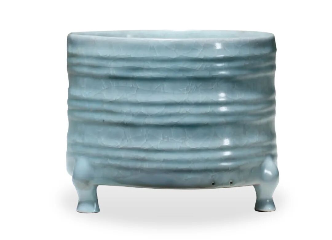 由于宋代金石学以及皇室尚古之风的兴盛,宋代仿古造型的器物众多,宋瓷以仿青铜和玉器盛行,此类香炉正是于这样的背景下出现的。本拍品即是仿高古青铜奁造型。这种器型极难烧成,薄胎为骨,多次施釉,天青之下,堆脂叠翠,层绽冰裂,融合了北宋汝窑到官窑技法被修炼到无以复加的高度,及至巅峰状态,浑然天成,叹为观止。