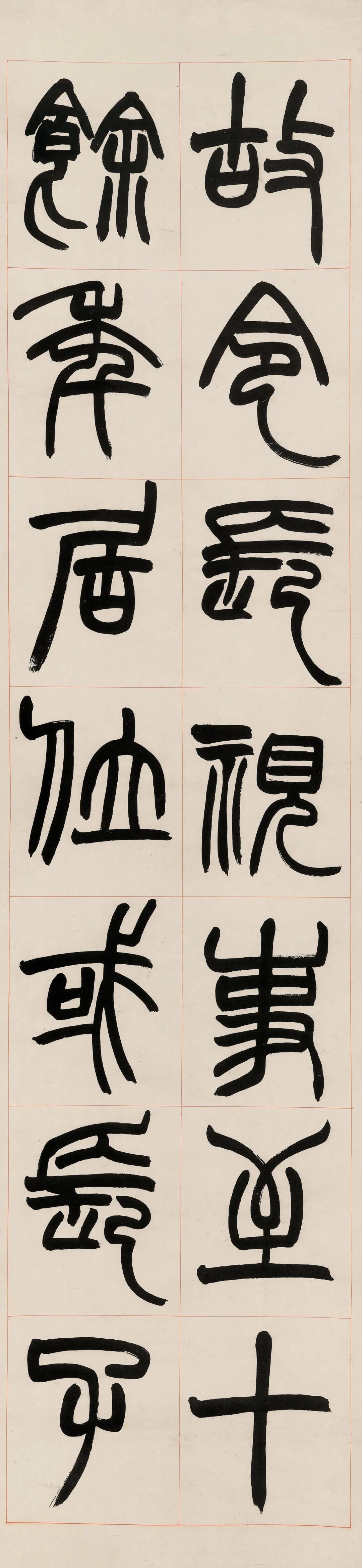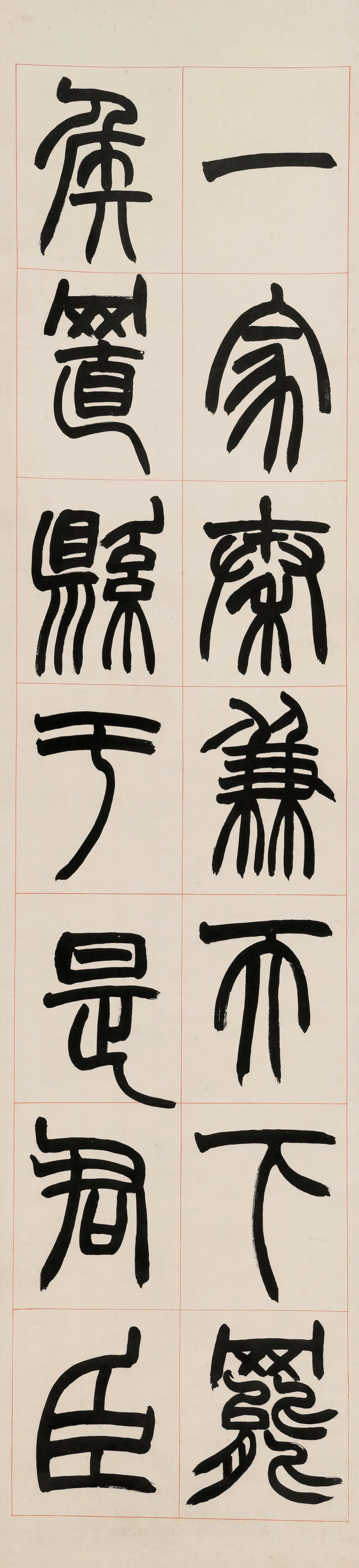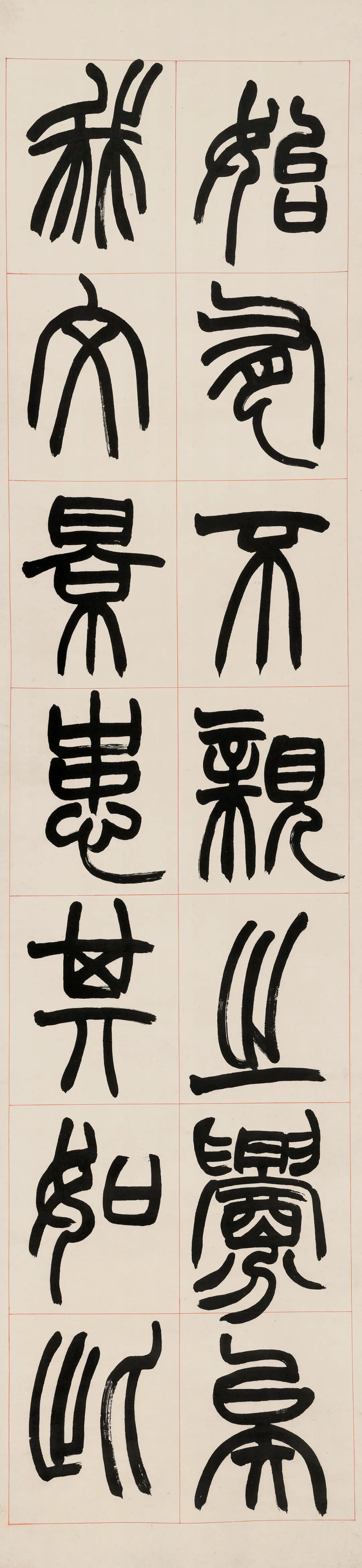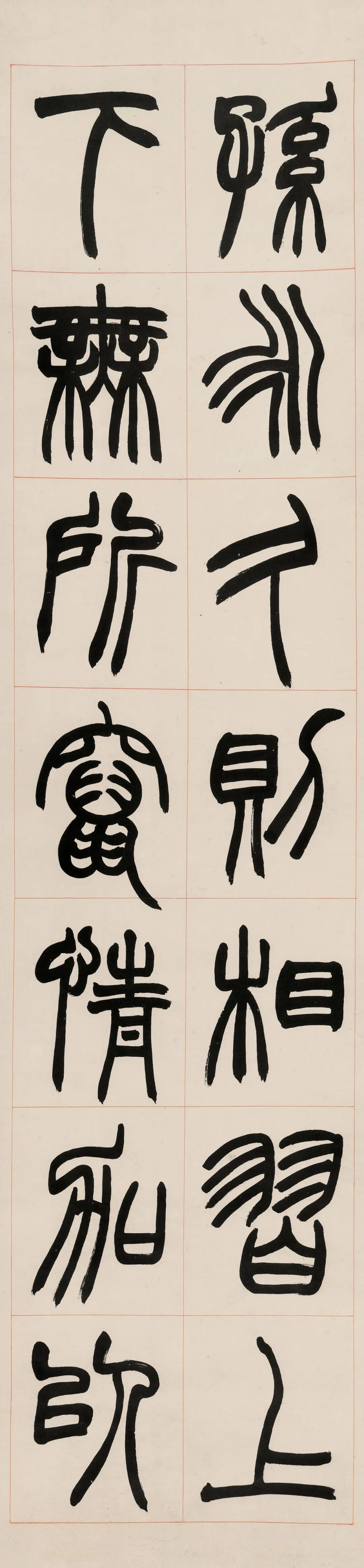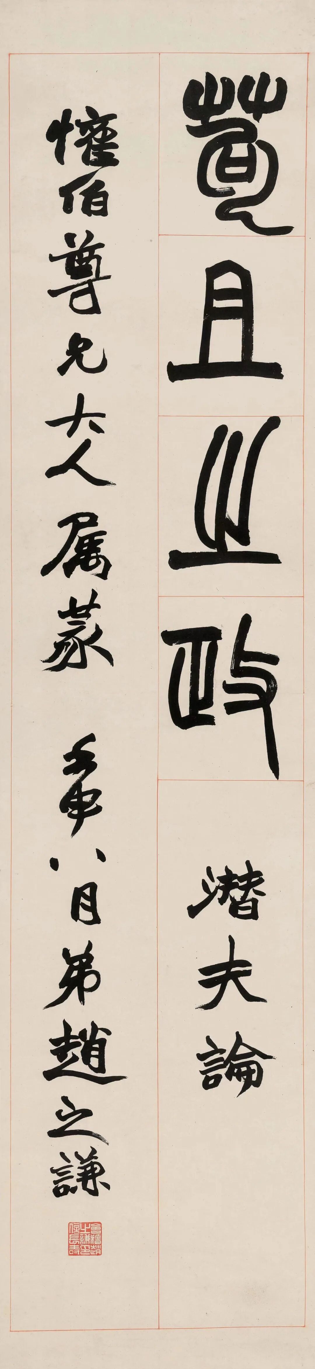 赵之谦篆书《潜夫论》八屏,宣纸本,书宗邓石如,融魏碑笔意,笔势浑厚,结体严整,张弛有度,沉劲俊美兼备,极具视觉感染力。款云“欢伯尊兄大人属篆,壬申(1872年)八月,弟赵之谦”,为我们了解《潜夫论》提供了一点线索。同治十一年壬申(1872年)初,赵之谦以国史馆誊录议叙知县,分发江西。五月,自北京返回浙江,十月,离浙赴任江西。居浙的几个月时间里,赵之谦会晤故旧,酬赠墨宝,仅在八月,就至少两次为“欢伯”挥毫创作:一,篆书《潜夫论》八屏:宣纸本,红线界格,题款“欢伯尊兄大人属篆,壬申八月,弟赵之谦”,钤印“会稽赵之谦印信长寿”,《悲庵賸墨》影印,即本件拍品;二,篆书四屏:宣纸本,有界格,题款“壬申八月,欢伯尊兄大人属篆,弟赵之谦”,钤印“叔”“会稽赵之谦印信长寿”,沈阳故宫博物院藏,《中国古代书画图目》影印,辽2-438。![]()