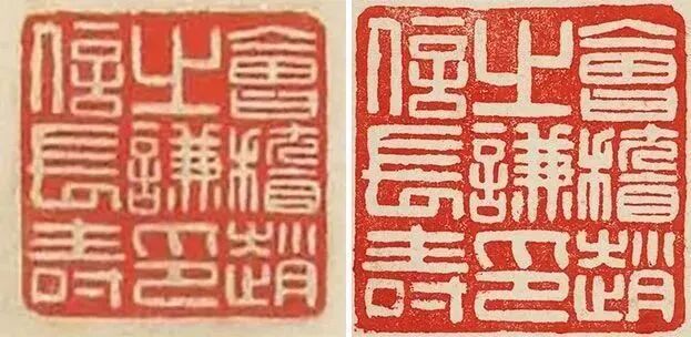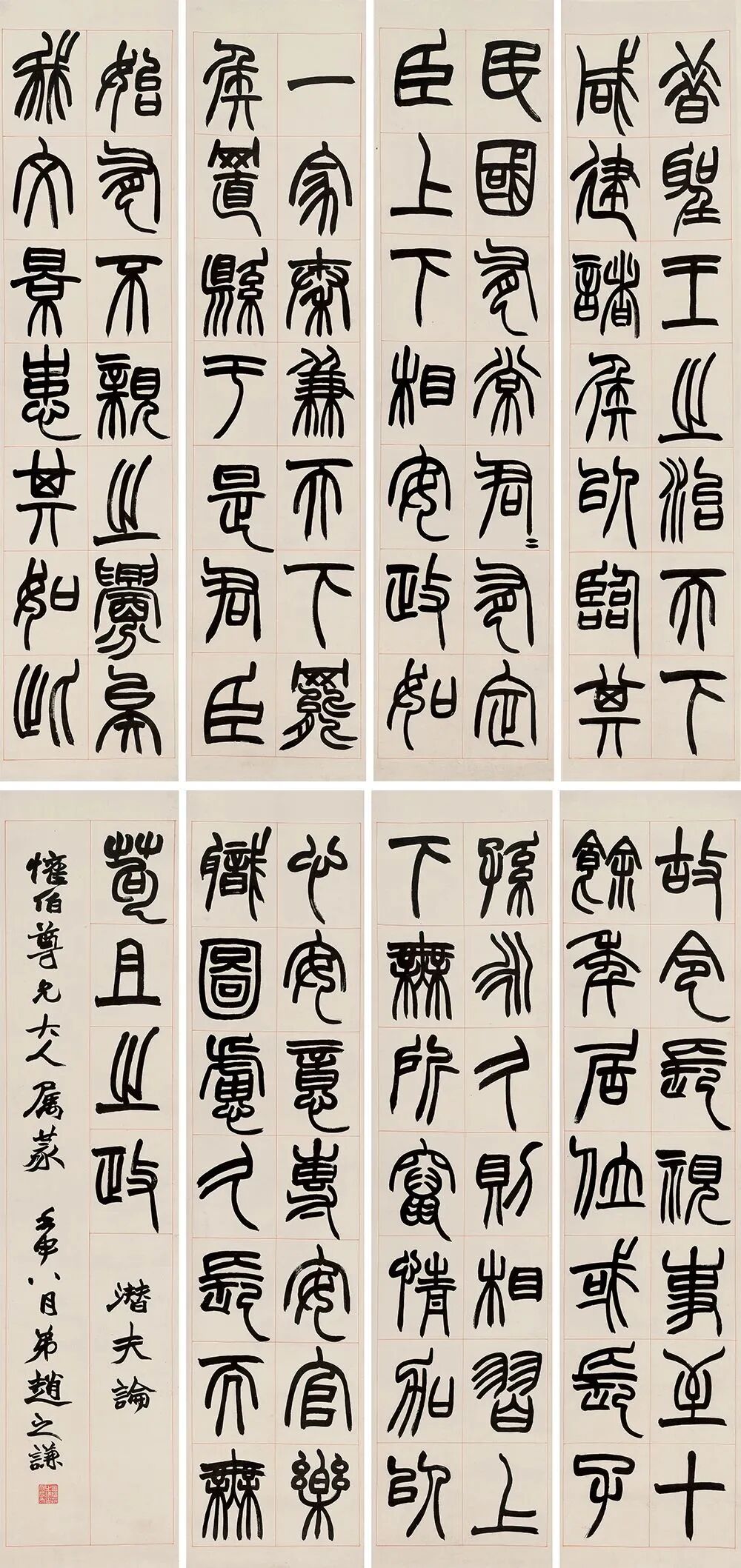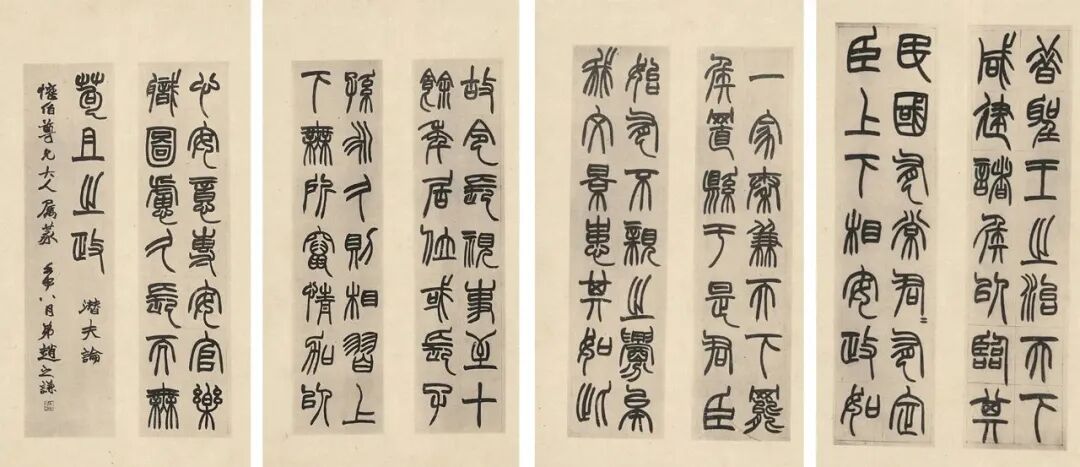 值得注意的是,《潜夫论》八屏与辽藏四屏书写于同一个月,无论篆书正文、行书款题皆呈现出一致的风貌。两组条屏使用了同一方“会稽赵之谦印信长寿”白文印章。甚至界格亦极相似。既印证书写时间接近,更说明赵之谦与上款人“欢伯”交情非同一般。![]()