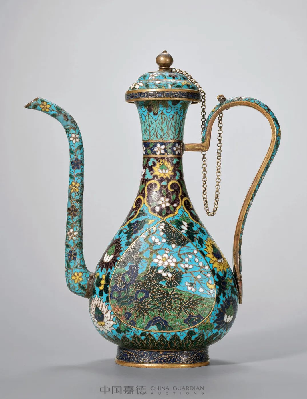 极为珍罕的“元 掐丝珐琅岁寒三友纹杏叶执壶”,仅大英博物馆有类似珍品,釉料莹润、配色素雅,文气十足,终以224.25万元的成交价为有缘人收藏,“元 玉八仙福山寿海大洗”为少见的玉雕文房作品,也是身份地位的象征,以92万元成交。“清乾隆 掐丝珐琅缠枝莲纹太平有象炉”气势郎阔,富丽堂皇,体现了清代鼎盛时期掐丝珐琅的巅峰工艺,以65.55万元成交。