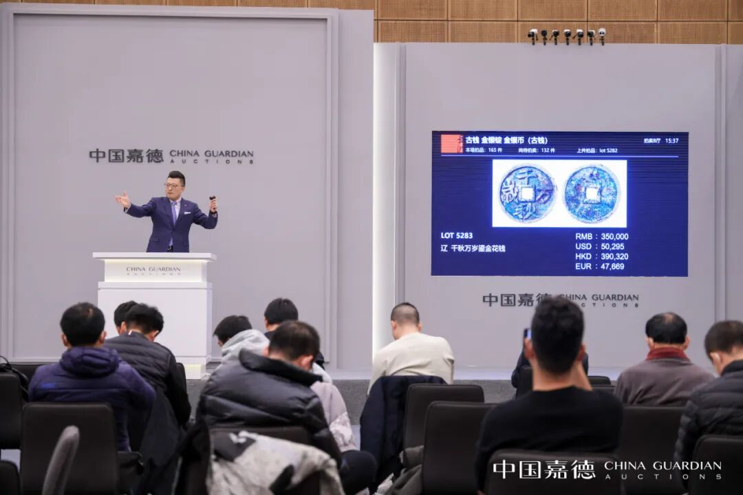 “辽 千秋万岁鎏金花钱”钱文深峻,遒劲工整,有隋唐楷书遗风,鎏金者更是现世珍罕,应为特殊仪式场景使用,以40.25万元的成交价拔得头筹。传世甚少、形制特殊的“南宋 临安府行用背准贰佰文省铜钱牌”为中国古钱重要名珍,为历代泉家珍视,以36.8万元成交。浙炉花钱名品“清 除邪辟鬼背钟馗浙炉花钱”以11.5万元成交。