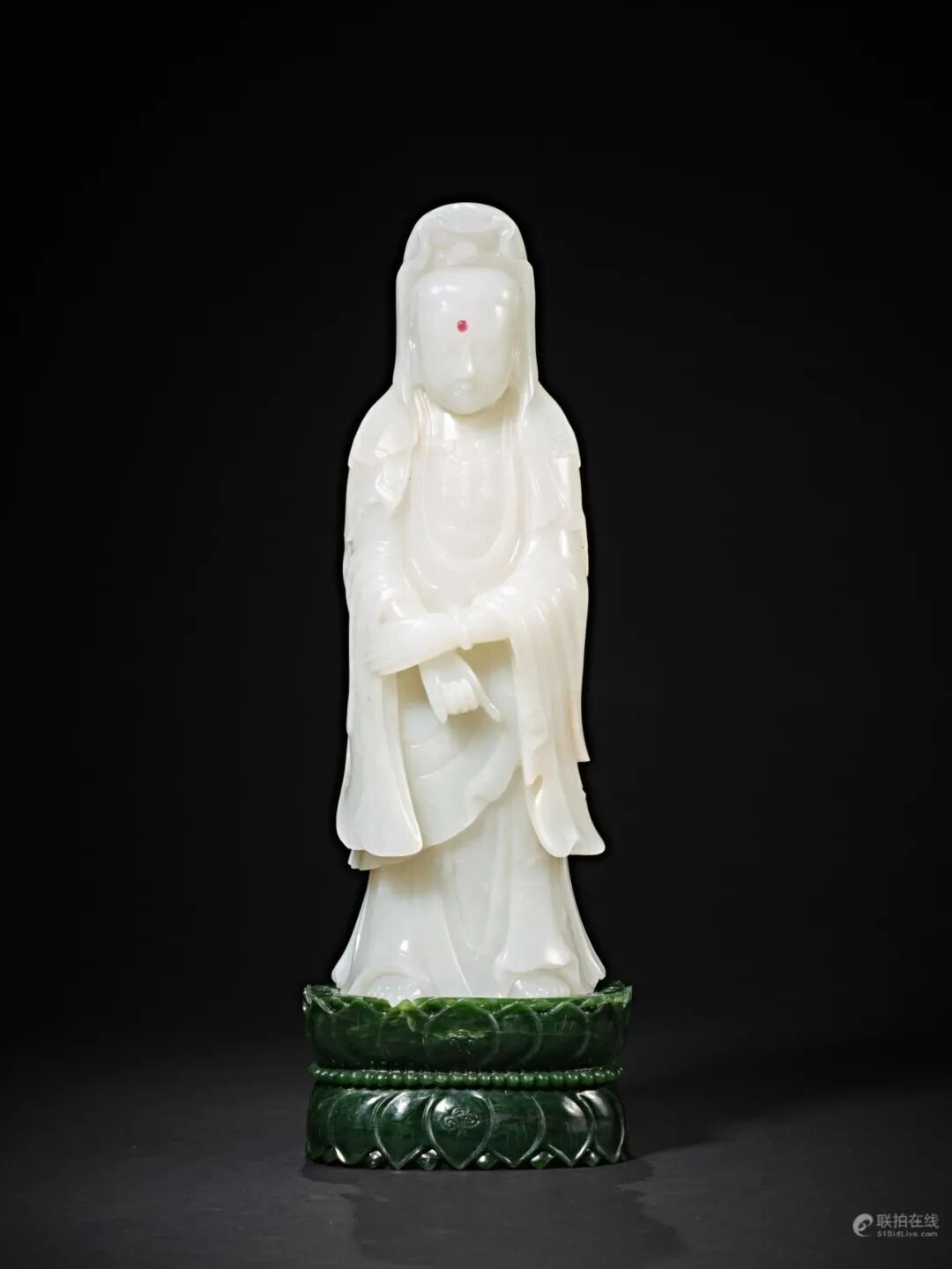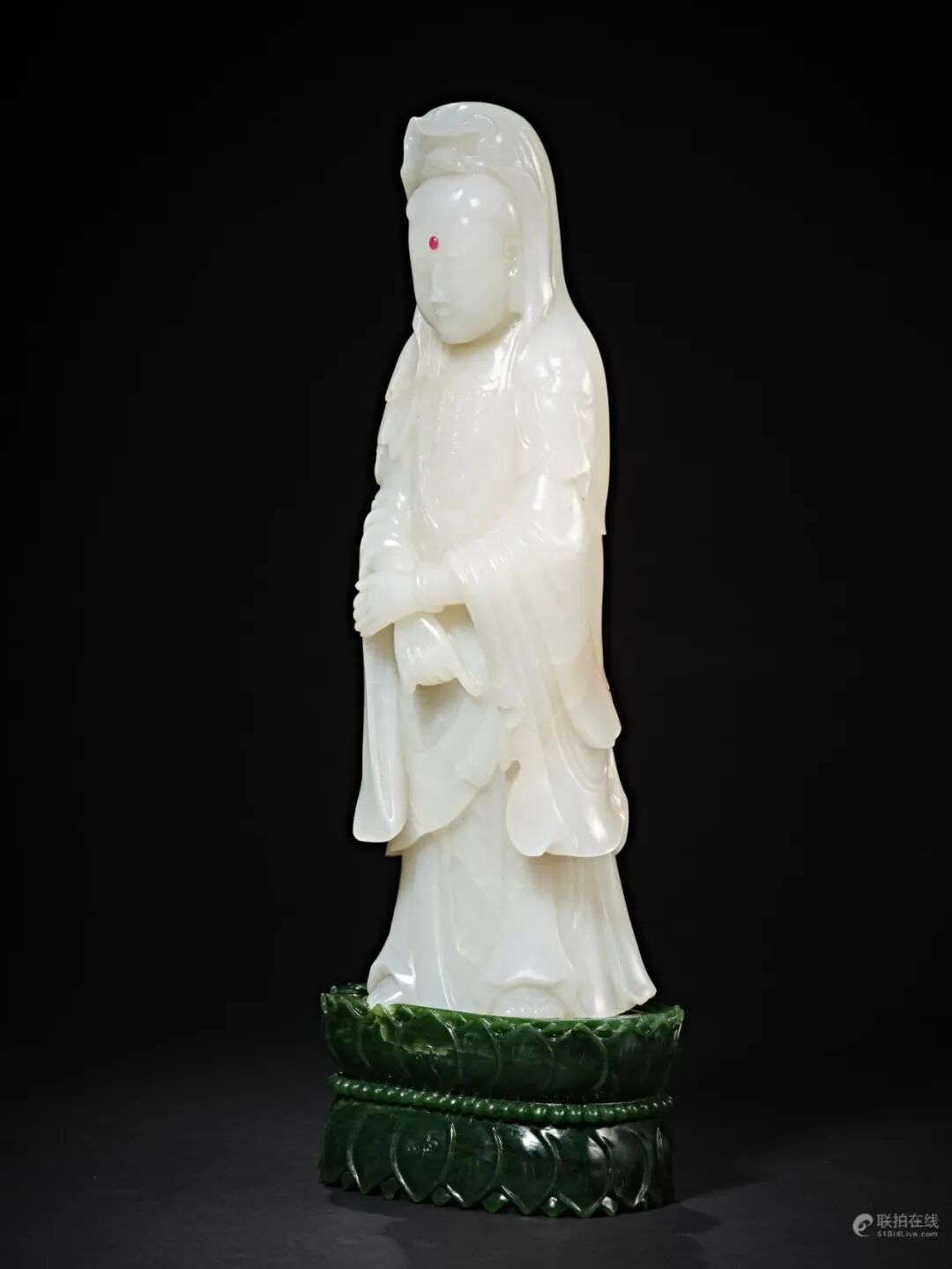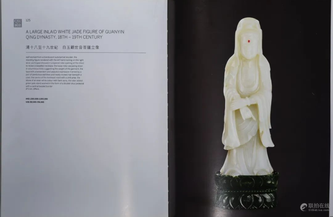 此尊观音造像选用大块上等新疆和田玉籽料,质色凝纯莹润,玉体通灵。观音头挽高髻,双目微闭,嘴角上挑,双耳垂肩,面容凝重慈祥,眉心巧嵌一红色宝石,同样做法常见于清代宫廷造办处所制玉器。身着天衣长裙,胸前装饰缨络珠饰,左手轻握于右手。体态优美匀称、线条流畅舒展,衬托出大士超然世外而又心怀慈悲的气质,脱于世间,入定于广阔天地,好似「紫竹林中观自在,白莲台上笑人忙」造像整体设计庄重大气,细部雕工简洁流畅,且玉料硕大、质地温润细腻,并带原出处,极为难得。