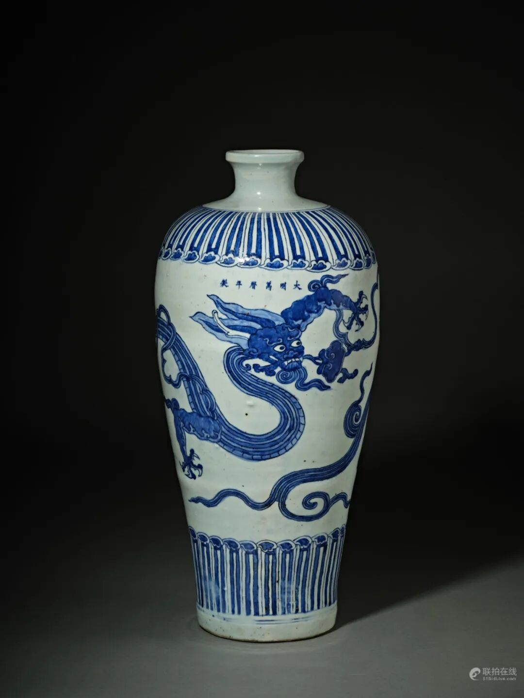 本品梅瓶小盘口,丰肩,深长腹,下腹斜收,隐圈足。通体施白釉,略泛青灰色,釉面光洁。梅瓶肩部及近足处上下以变形莲瓣纹装饰,瓶身主体绘龙纹,四爪龙腾空盘旋而上,张牙舞爪,跃于画面之间,腾云驾雾,口衔灵芝,亦有福寿之寓意。整体梅瓶器型修长,隽秀挺拔,青花色泽淡雅,肩部莲瓣下方落「大明万历年製」单行楷书款识,为典型明万历时期大器落款制式。
