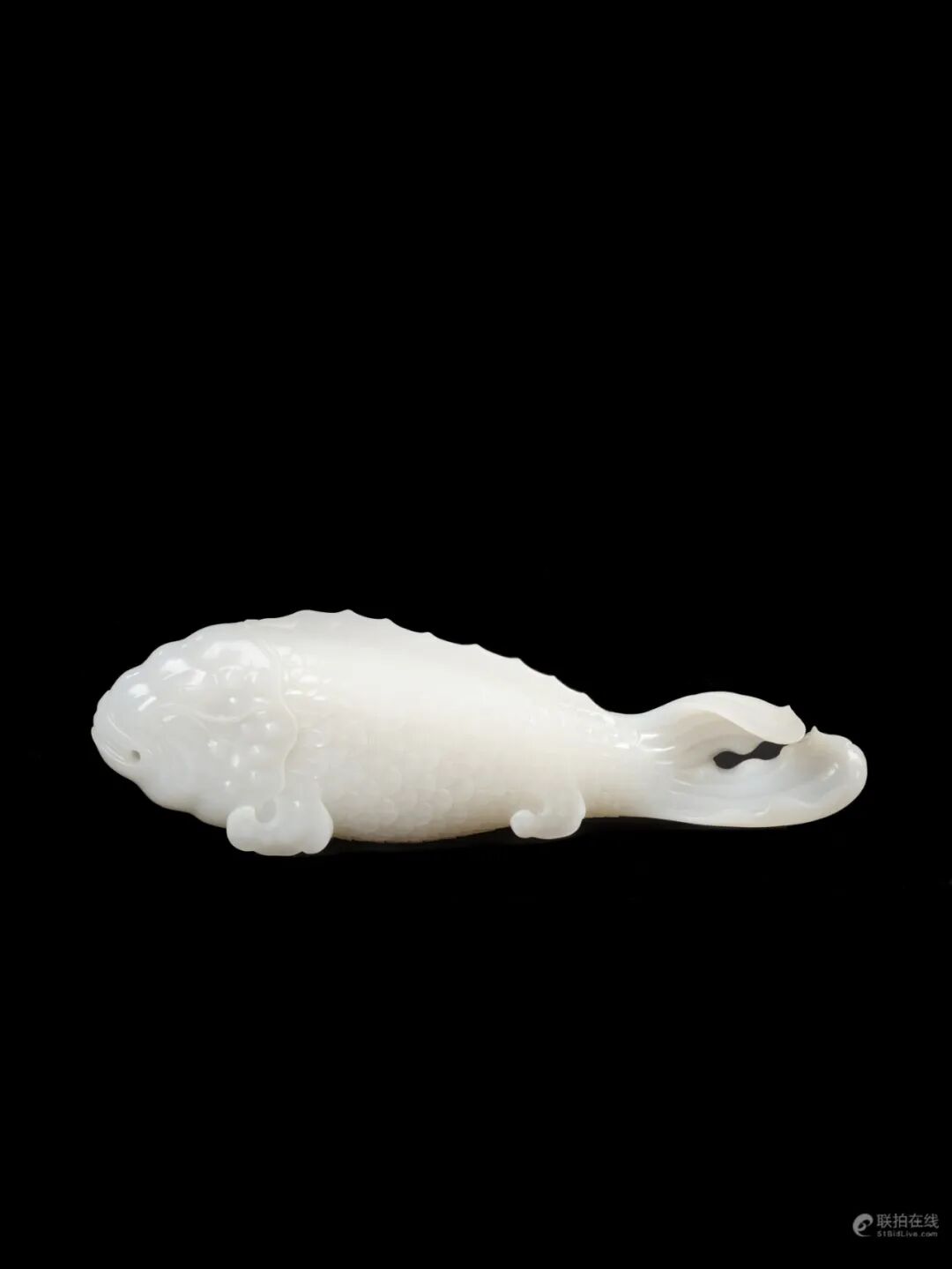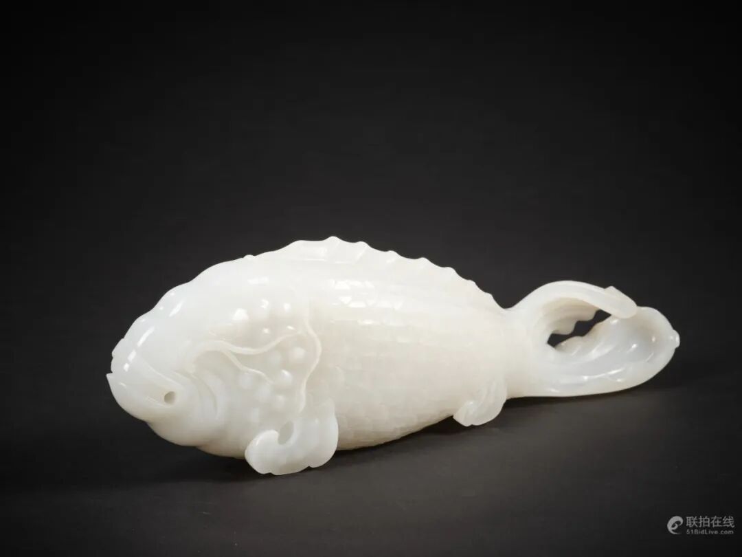 此摆件用上等和阗羊脂玉雕作,质地温润光泽,色泽莹润,使用圆雕及浅浮雕技法雕鱼,鱼口微阖,鱼身丰腴饱满,身尾相连,鳞片分明,片片中心皆起阳线,鱼尾部自然卷曲分叉,尾鳍包裹鱼身,形成器足,似水中腾飞跃起龙门之锦鲤。诗云:「金鳞岂是池中物,一遇风云便化龙,福如东海长流水,化缘龙渊得玉英。」相传在远古时代,金、银鲤鱼欲跃龙门,入云端升天化为行龙,古时为帝王常将此物置于书房寝殿,堪为案头佳器。作品题材吉祥,雕琢精湛,刻饰流畅,为不可多得之玉雕精品。