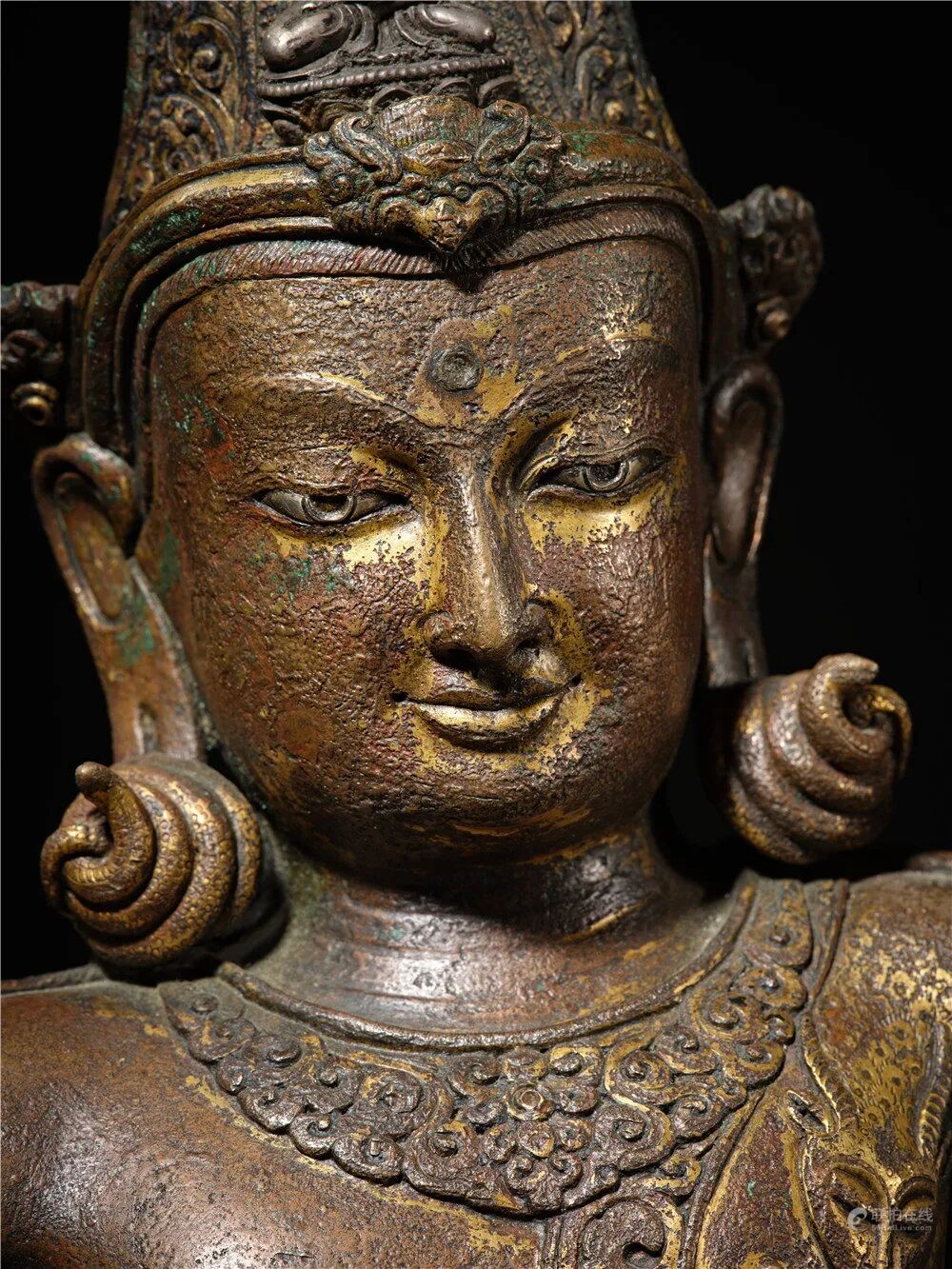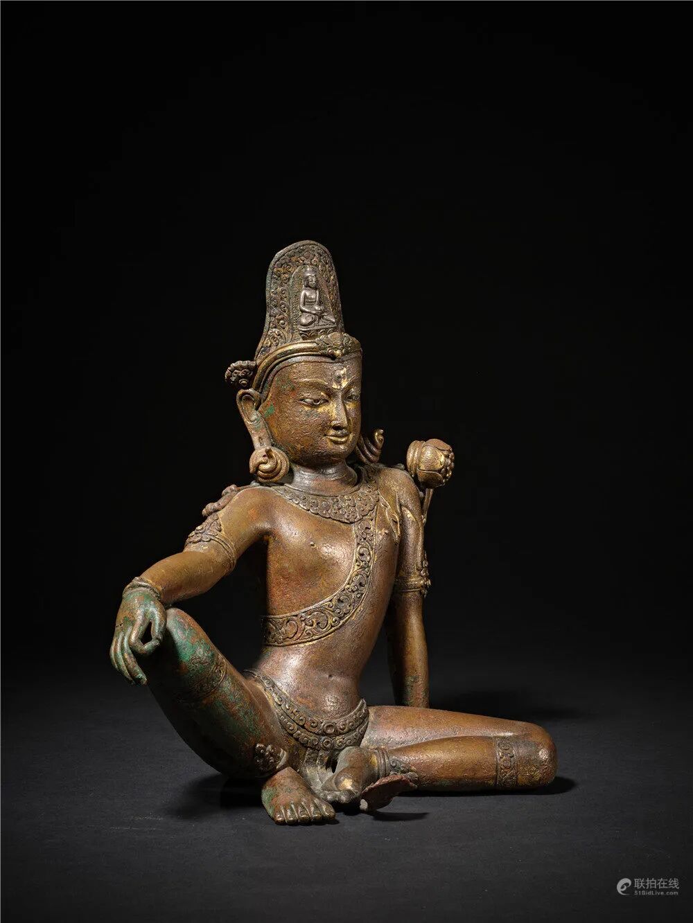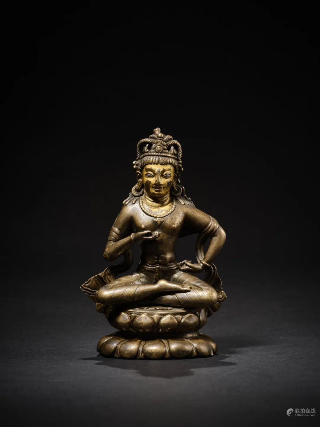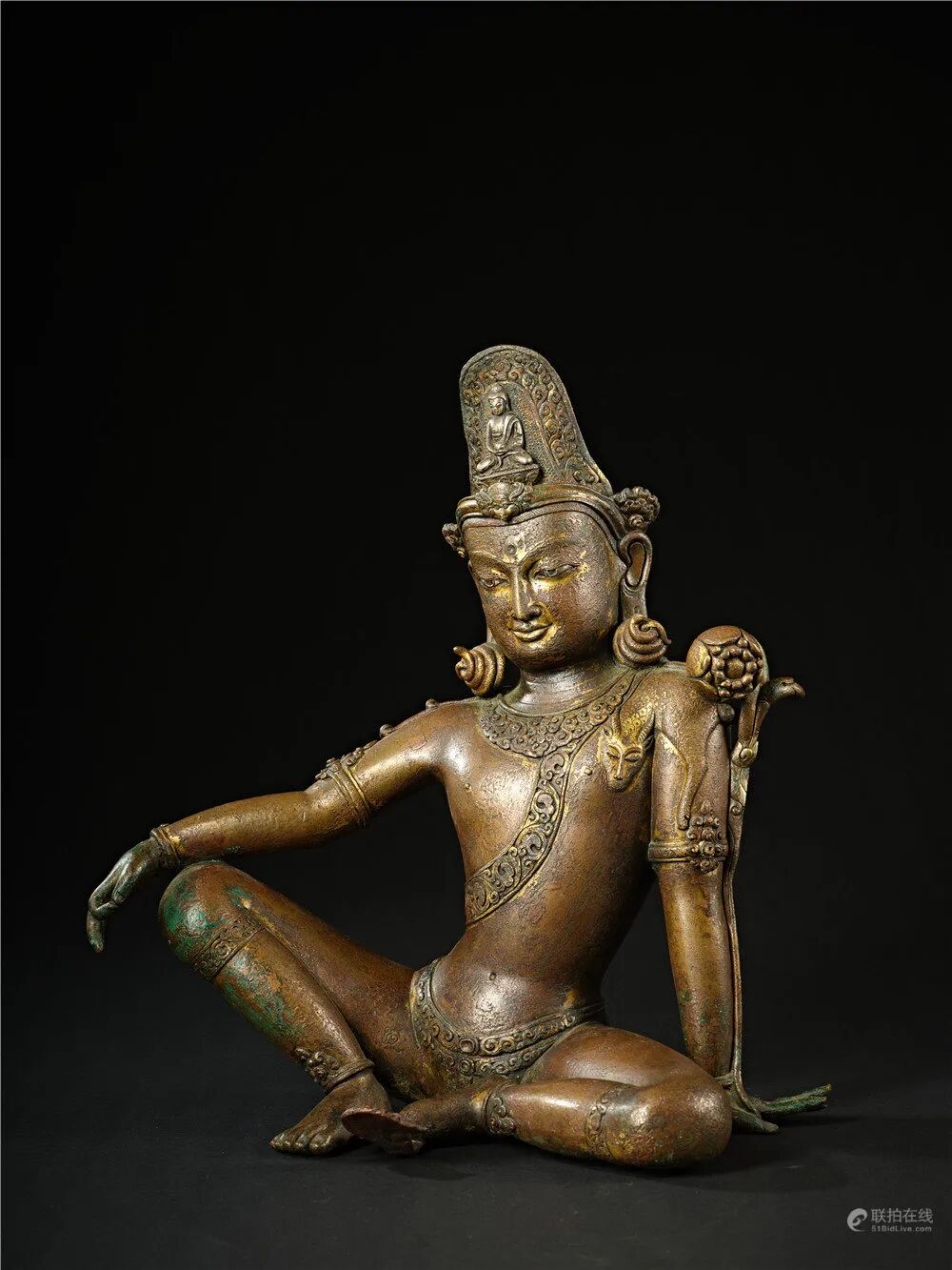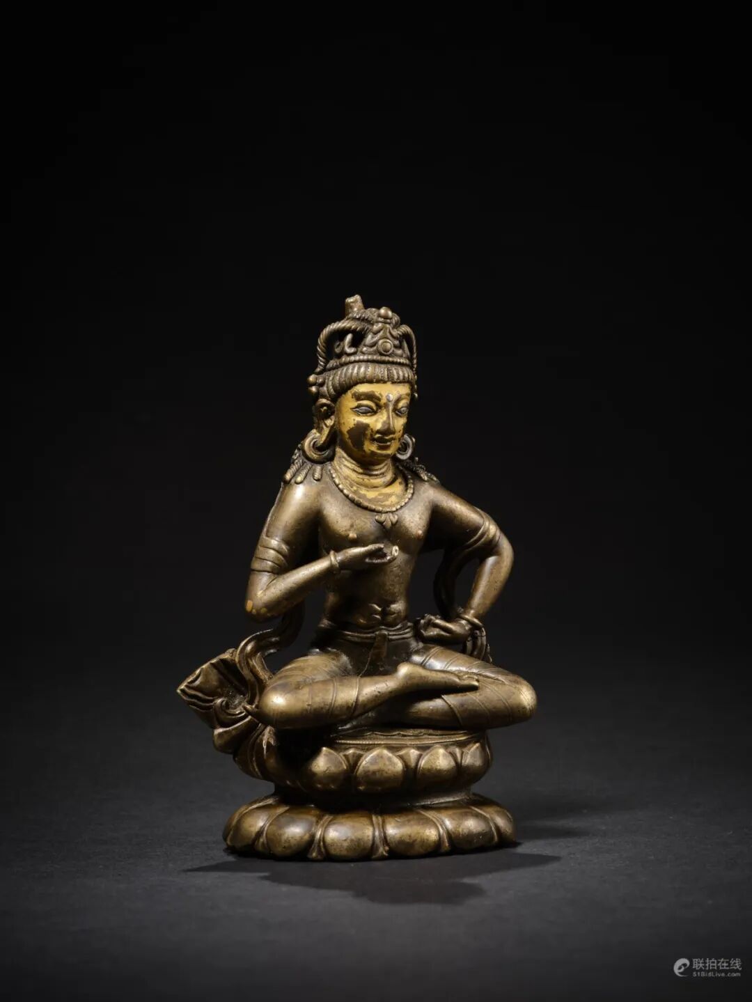 莲花手菩萨是观世音菩萨的常见化身,莲花手菩萨救度六道众生,造像大多以手持莲花为标志。眼前的莲花手观音自在而坐,呈帕拉王朝的典型开脸,脸颊丰满,眼睑低垂,嘴角微微上提,唇线清晰,下唇宽厚,下巴丰满,造像面相庄严,肢体语言丰富,神态活泼而富有神秘感,呈现出印度人的典型相貌,作品原始的气质与神韵已经显露出来。左手嵌一茎莲花,右手平伸于膝前施与愿印,莲茎依手臂至肩头。发髻高耸,中央端坐银制阿弥陀佛。菩萨躯干轻微向左摆动,头部向反方向倾斜,身姿动感具有活力。肌肉起伏自然、质感柔软。身披络腋,腰缠裹身长裙,腿部錾刻有圆形花朵纹饰。整体合金铜铸造,典雅殊胜;铸造技艺精湛,加工手法娴熟,包浆丰润,是尼泊尔马拉造像艺术中代表性作品。