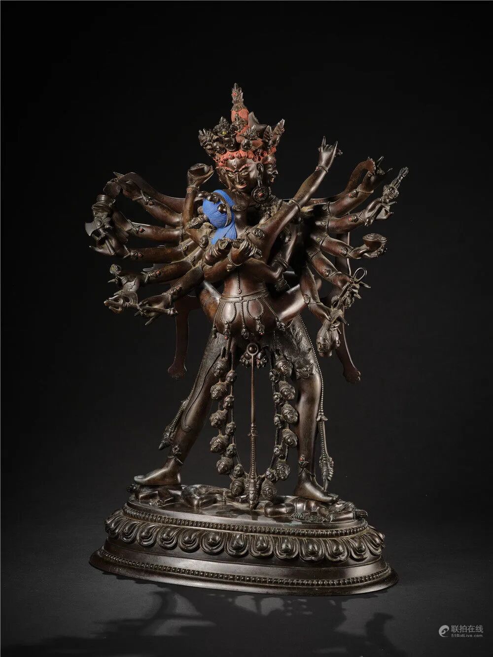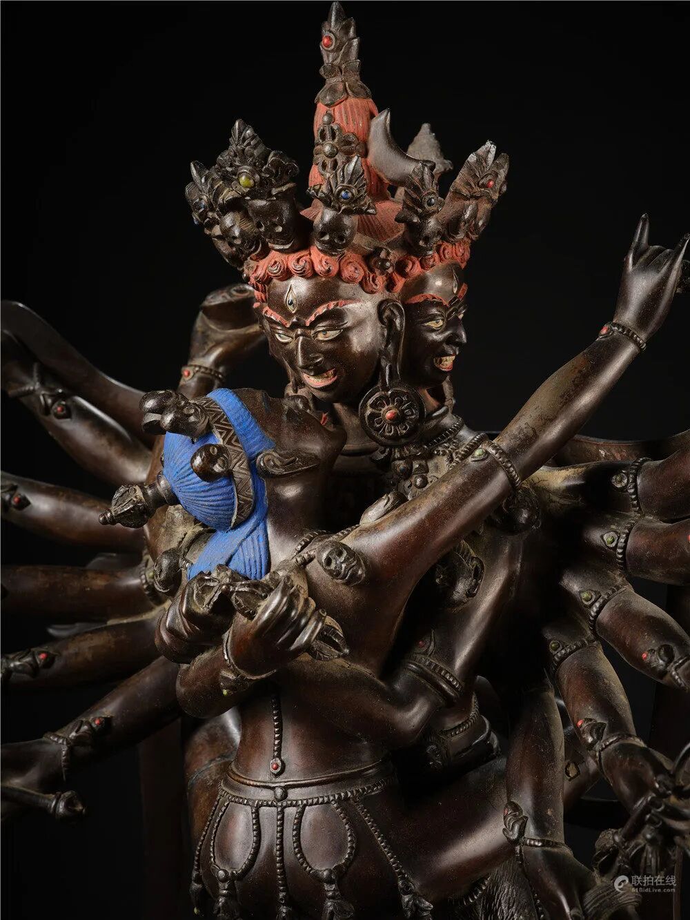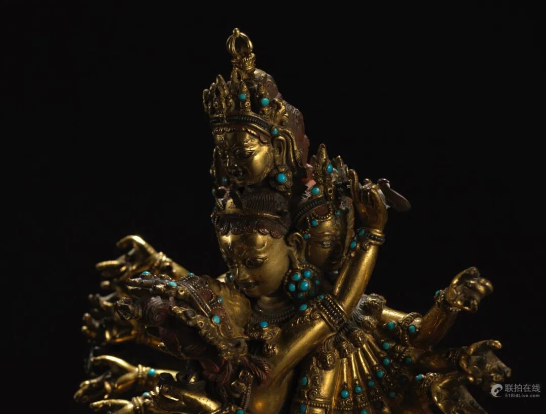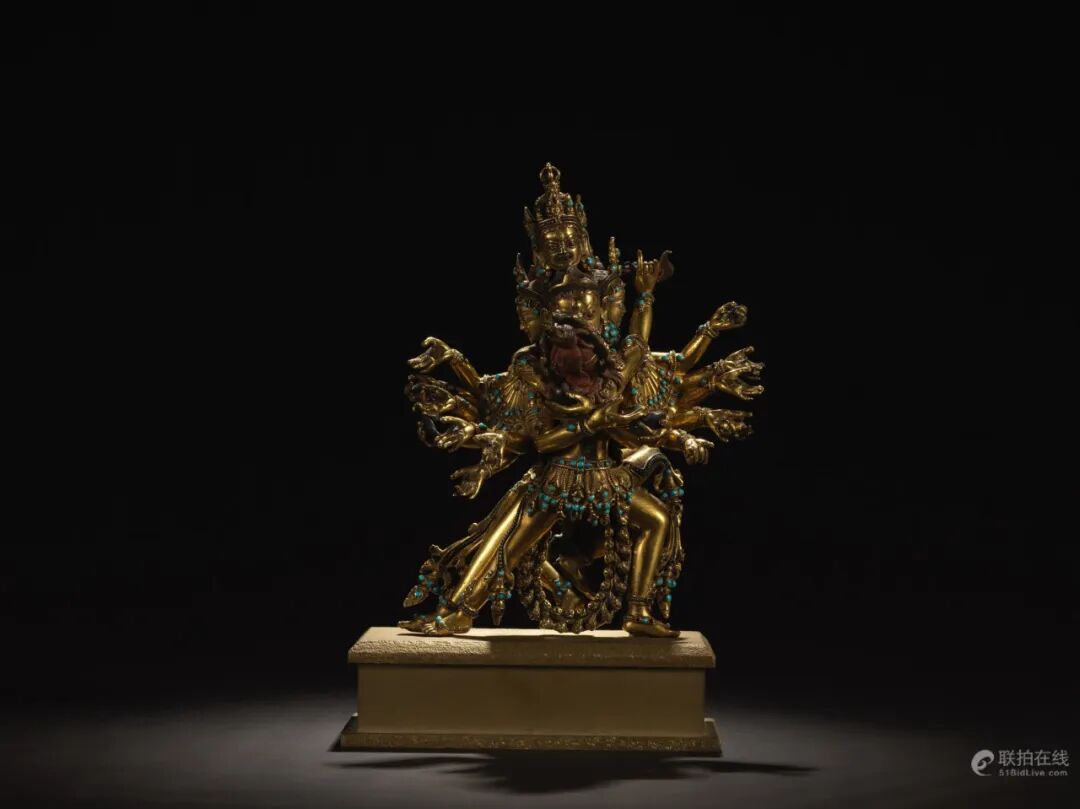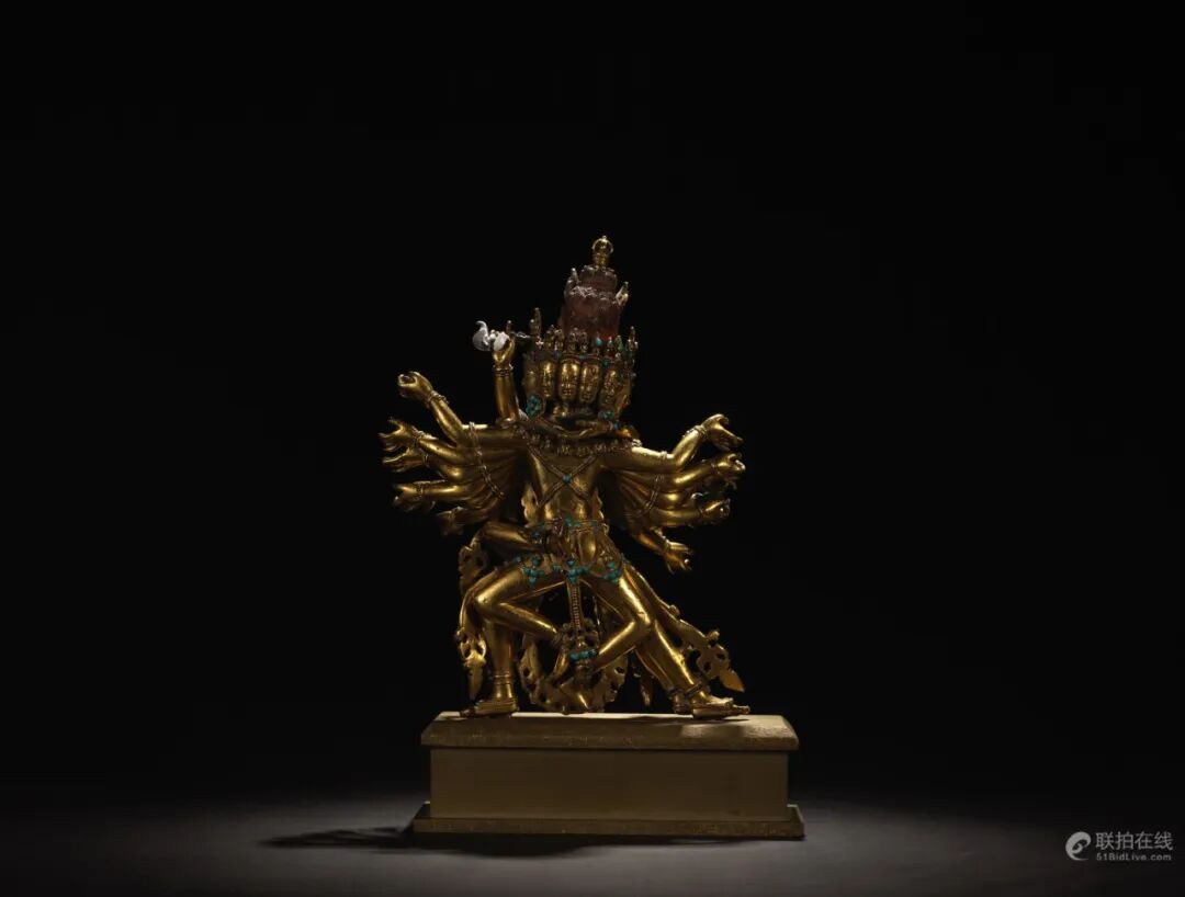 喜金刚又称饮血金刚,藏语称「杰巴多杰」,是密宗无上瑜伽部母续尊奉的重要本尊,为藏密萨迦派主修本尊。此像为八面十六臂双身形象,八面各三目,每头皆戴花冠;十六手是中二手抱明妃,其余手伸向两边,手中皆持不同神物。展右弓步站立。明妃叫金刚无我母,右手握月刀,左手捧骷髅碗。主尊与明妃衣饰相同,披璎珞挂人头蔓,腰带丝绦配饰上多各嵌宝石。整尊造像金水厚重,保存完整,为收藏上品。