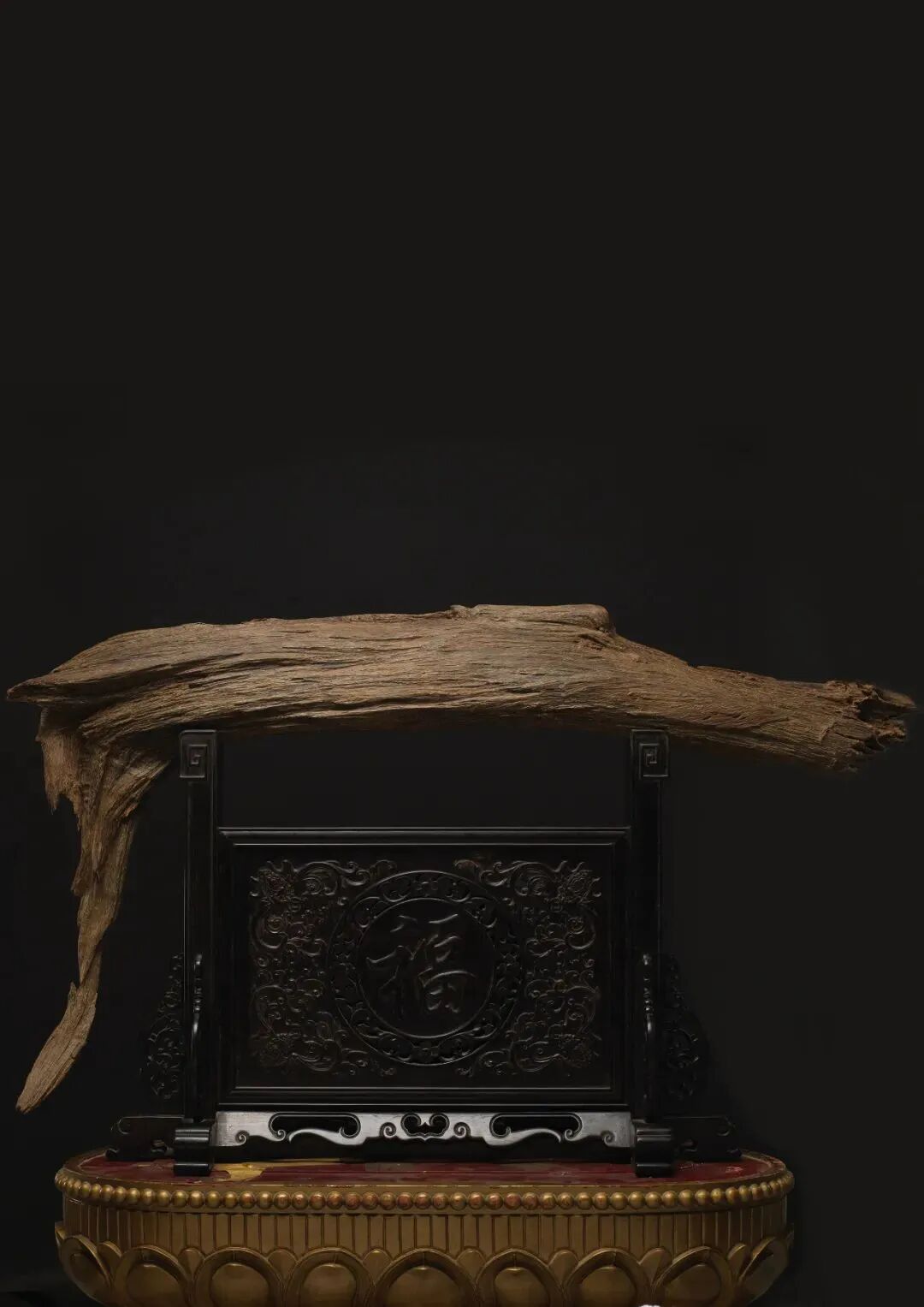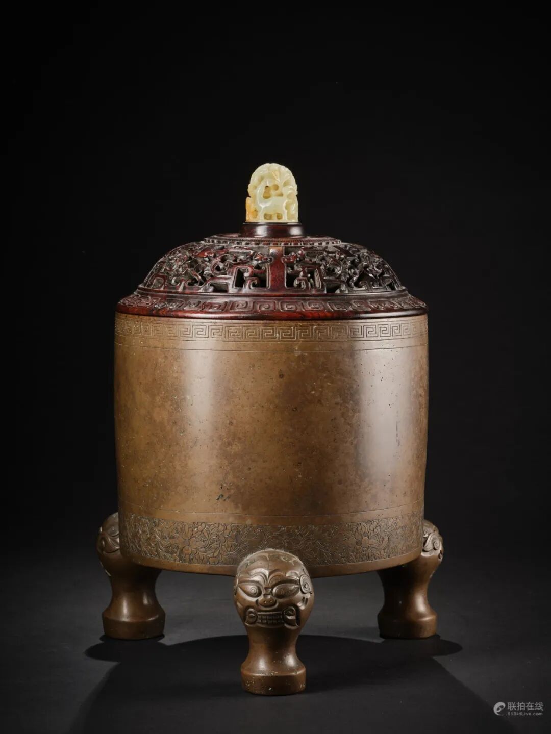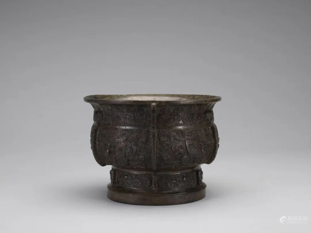 宋代随着当时商业的发展,古玩收藏在文人士大夫间风靡,出现了作伪上古青铜器谋取利益。另一方面,由于金石学兴起,官方收集了大量的古代青铜器,并更正了《三礼图》的错误,遂改依古代青铜器仿制礼器,用来作为庙堂之祭器。此件铜筒式炉即是结合宋瓷之典雅者。筒身直壁,口沿厚实,回折纹与花卉纹将炉身分为三部分。整器厚重古朴,器型端正大气,配紫檀盖座,既贵亦雅,精华在隐显之间,极妙。