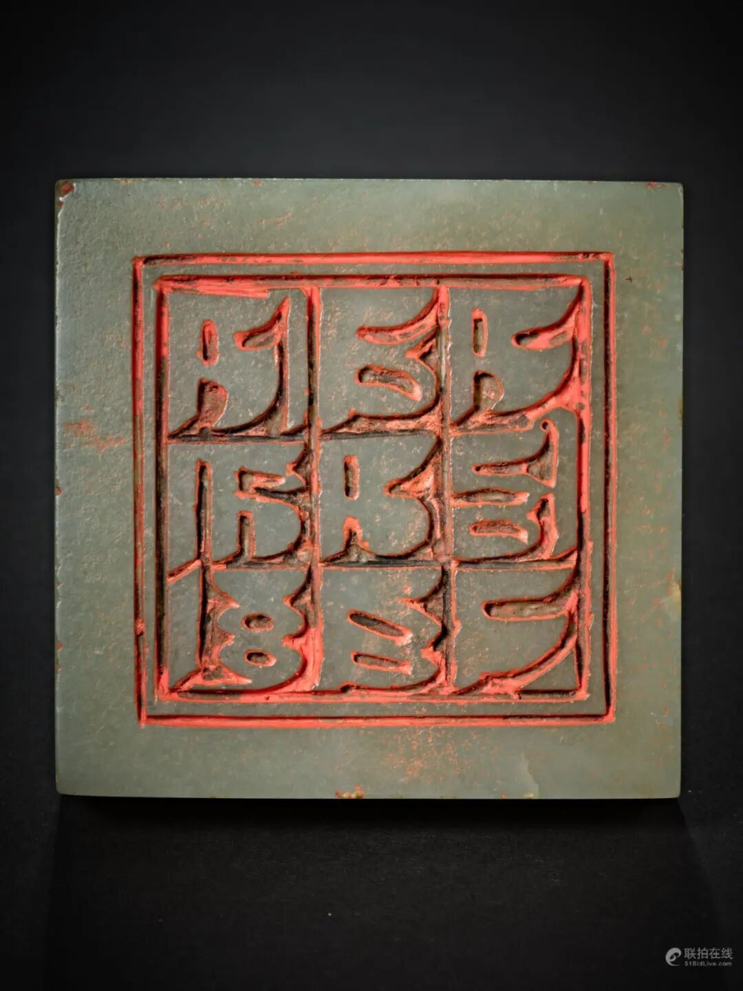 此印青白玉为质,色泽清新温润,钮圆雕成螭龙一条,躬身伏地,螭龙单角厚伏,双目凝视前方,螭龙身体以阴刻细工刻画鳞甲及毛发。印章成四方形,印文为梵文九字,Sarvasiddhi-Manorasha,意为「一切成就满足」。用刀深峻。此印规矩有度,印钮有皇家气韵,极有可能是宫廷造作,用于法事之印信。