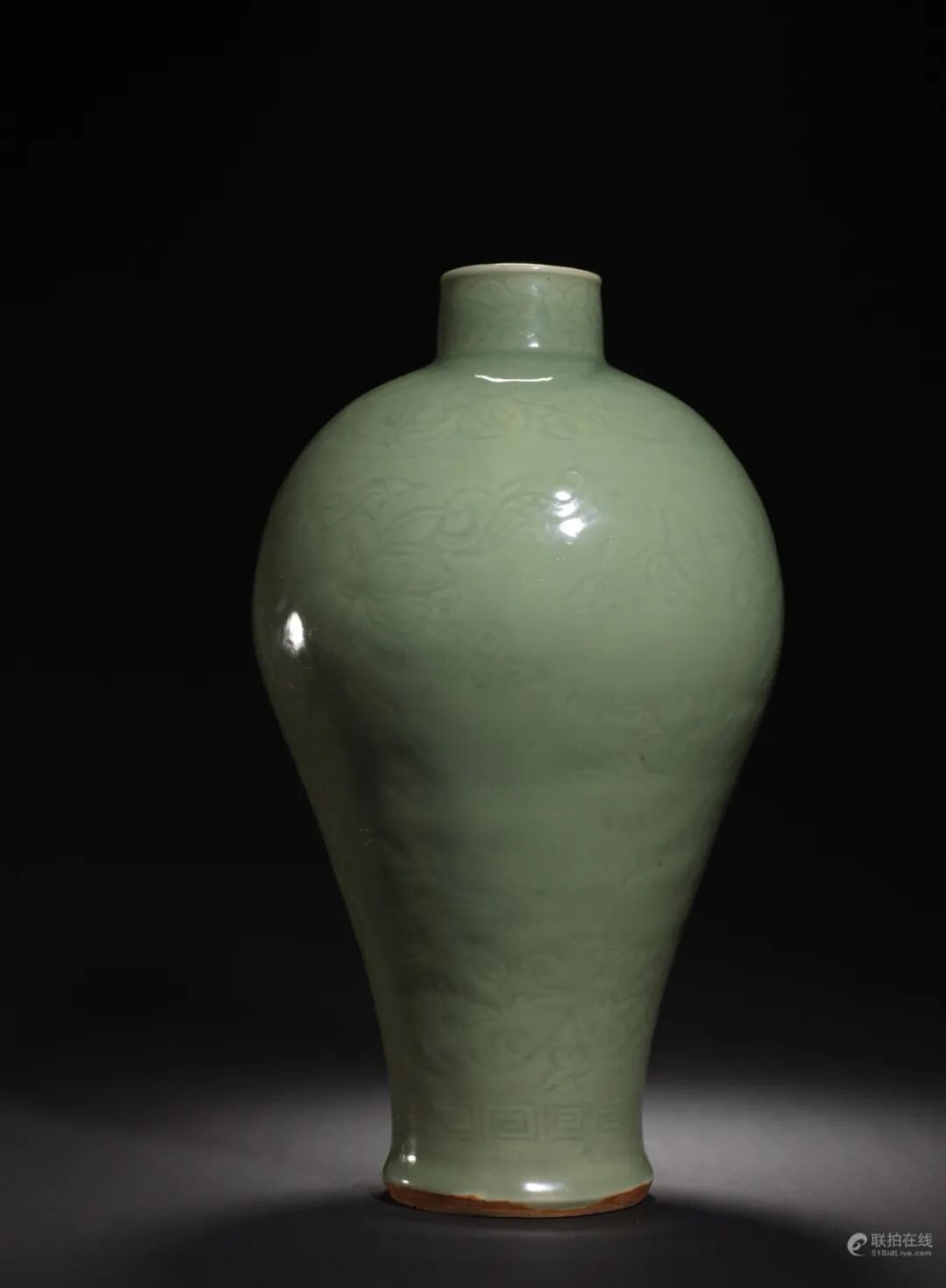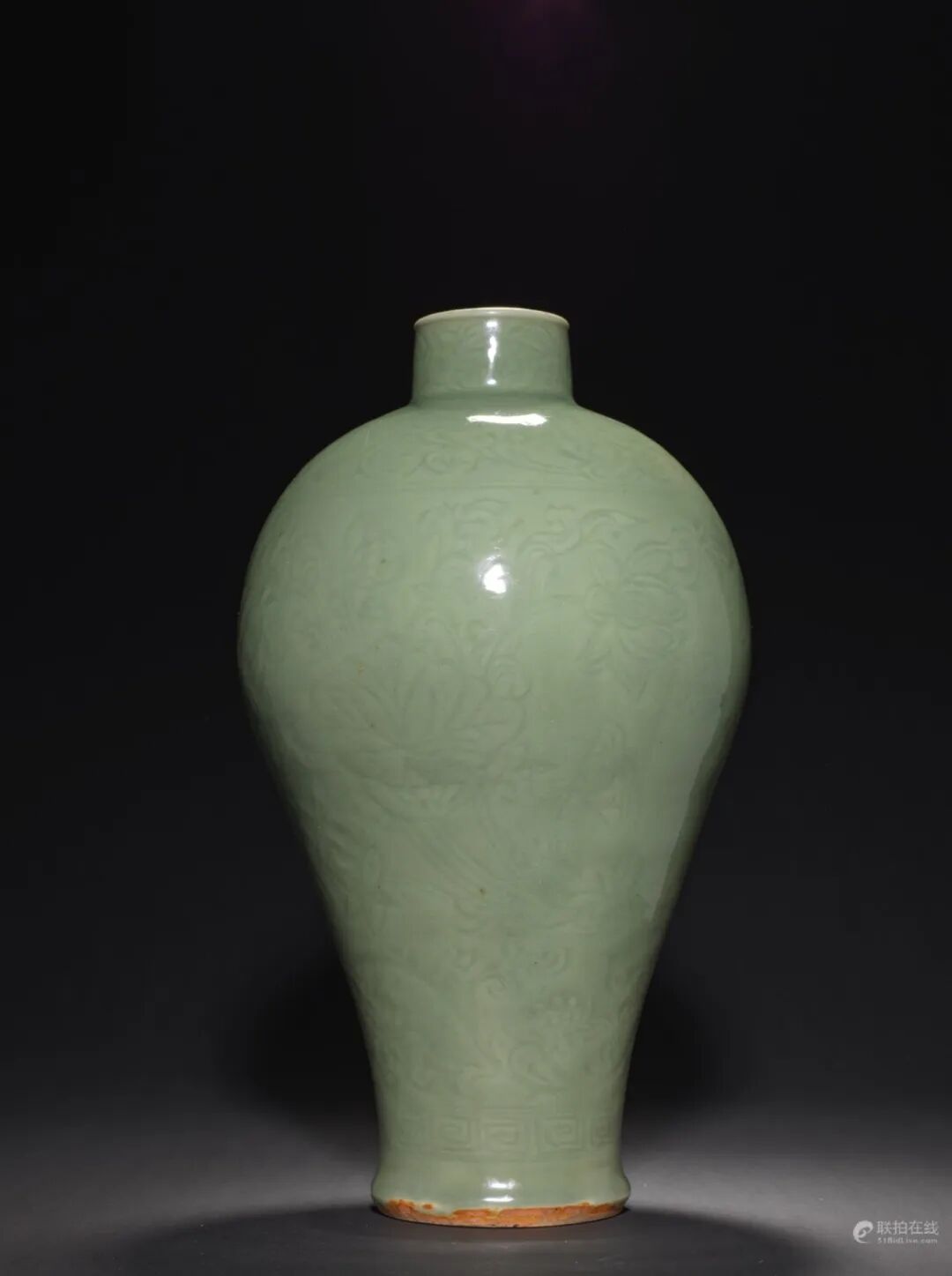 本品圆唇,短直颈,溜肩,腹部向内斜收,胫部外撇,圈足,身姿婀娜纤细,韵致非凡。通体施龙泉青釉,釉面光润凝莹,外壁划刻饰,自上至下共三层,口部以缠枝花卉环绕,肩部饰藤叶纹,腹部以河水莲花纹为主,近足处有回纹一周,每层纹饰之间以弦纹相隔,布局紧凑但有序。足底涩胎,胎与釉面相接涩胎处呈火石红更显古朴。