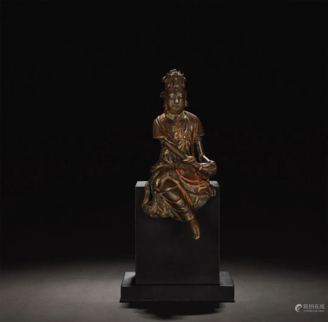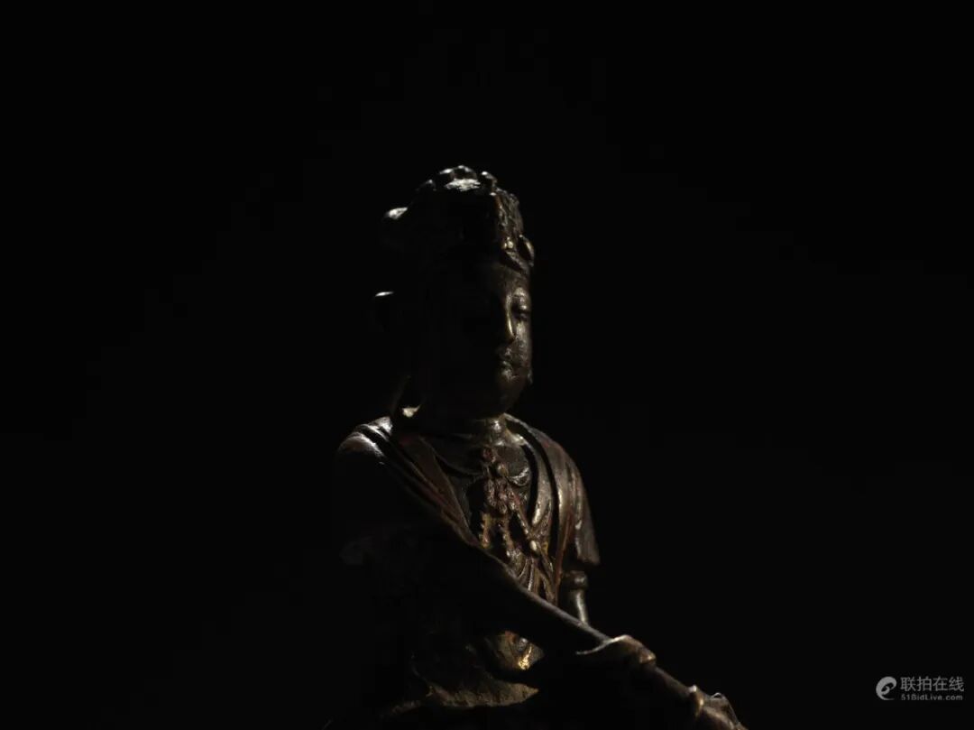 观音,因其形象变化最繁,式样最丰富,名称最多,但传播亦最广。许多观音造像,形态服饰完全汉化,符合中原的传统观念和审美倾向。因此,自佛教传入,大量观音造像,多有依据世俗的审美情趣和要求塑造,其形象或坐或立,神情兼具,倍添一种唯美氛围。此尊自在观音样式,具有唐以来所独特的汉式风情。脸庞圆润,表情温和,身姿曲线优美,坐具简雅而特殊,上下交错呈现,十分美观。