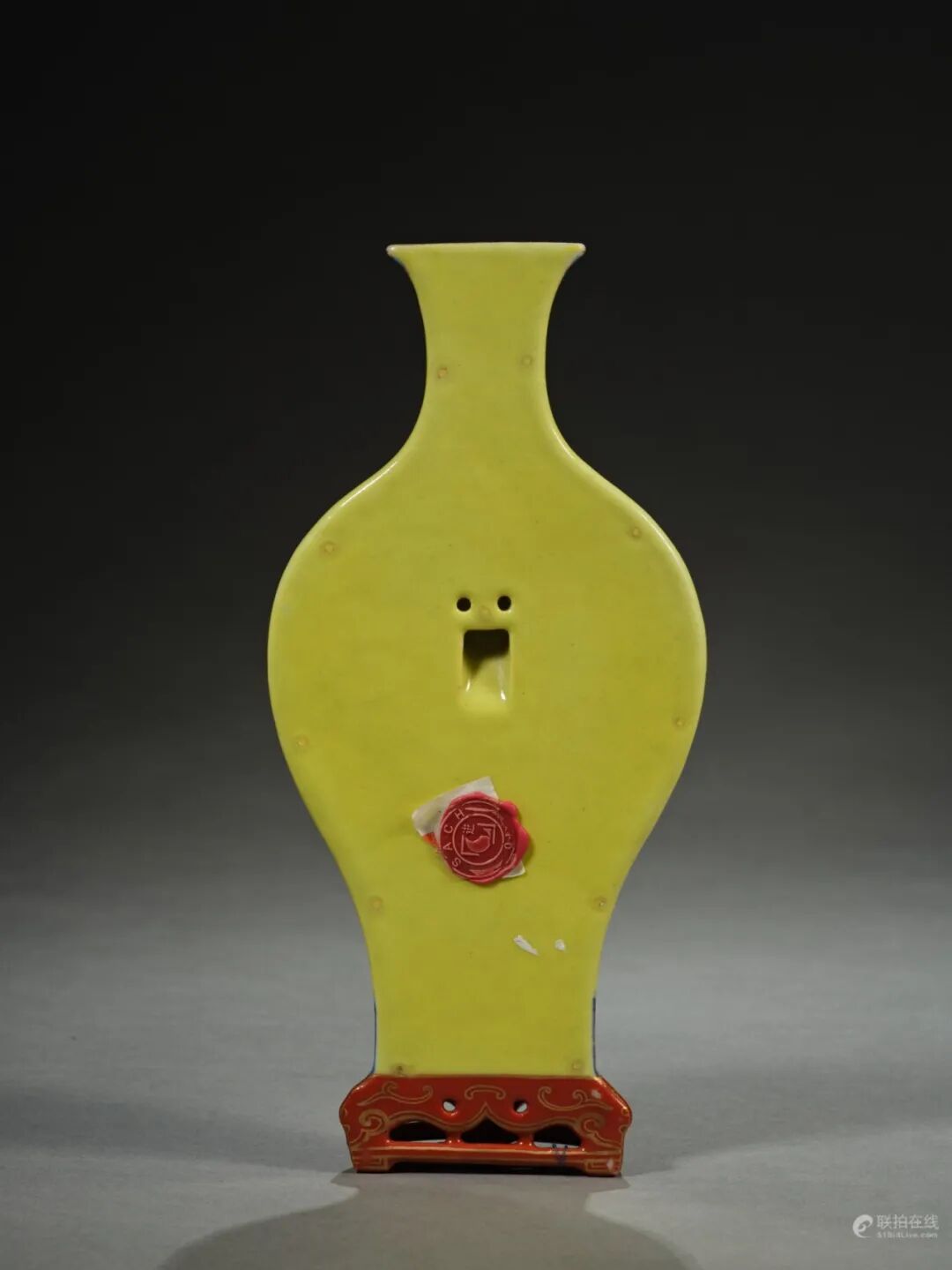 轿瓶呈半面花瓶形状,背部平坦,有孔,用以悬挂墙壁之上。瓶撇口,束颈,鼓腹,足颈束直,瓶体修长,下有仿木座托,浑然一体,设计巧妙精致。底座内红地描金书「大清乾隆年製」六字篆书横款。轿瓶通身施黄釉,鲜艳动人,娇嫩匀净,釉面光亮如一泓清水。瓶口沿绘如意云头纹一周,足颈饰莲花瓣纹,足下座托施红釉,描绘如意纹、卷草纹。其余通体绘螭龙穿花纹样,螭龙以蓝彩细绘,龙身卷曲,与缠枝莲花勾连,衔接自然,蜿蜒曼妙。莲花清芬,宝相花华贵,施彩明艳妍丽,线条流畅,突显神韵,赏心悦目。瓶腹描金开光,以墨彩绘亭台山水图案。亭台楼阁绘制精细,规矩有度,远山空寂,静水深流,草木繁盛,颇有水墨风骨,雅致清新。全器采轧道工艺,剔勾花纹细密如锦,更添繁复华贵之皇家气息。