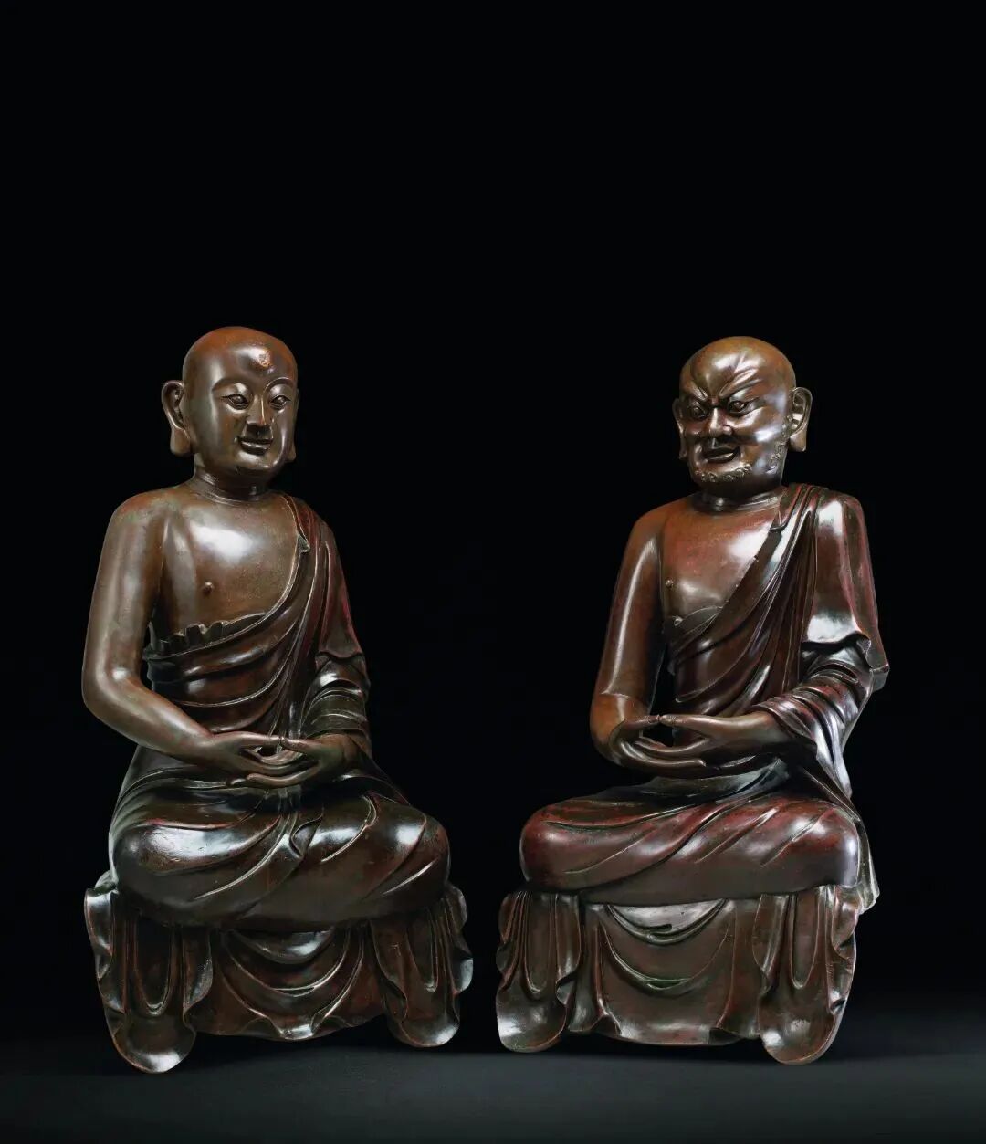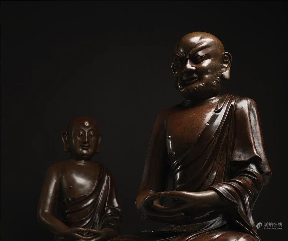 罗汉信仰虽源于古印度经典,然古印度尚未见到明确的罗汉造像,因此,罗汉信仰基本上可以视为佛教汉化过程中产生的本土信仰,而其造像艺术也发源于中国。唐永徽五年(654)玄奘译出《法住记》,此经专说十六大罗汉,罗汉信仰及其造像艺术自此于中国扎根,逐渐于晚唐/五代时期成形。宋代是罗汉信仰的鼎盛时期,由于各种关于罗汉的灵应故事透过文士名宦的记载宣扬,使得上从帝王,下至庶人,无不虔诚敬事供养。此对铜罗汉像制作精美,体型硕大,形象是两位僧人,皆着右袒的汉式僧袍,迦趺而坐,姿态闲适,气度雍容,法相庄严。