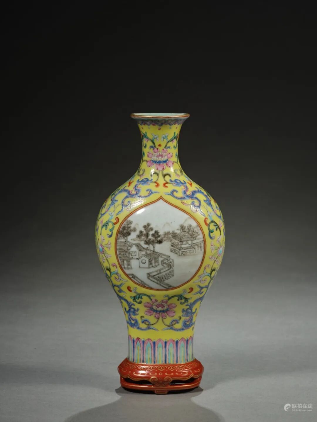 清乾隆 黄地轧道洋彩夔龙拱花开光山水轿瓶