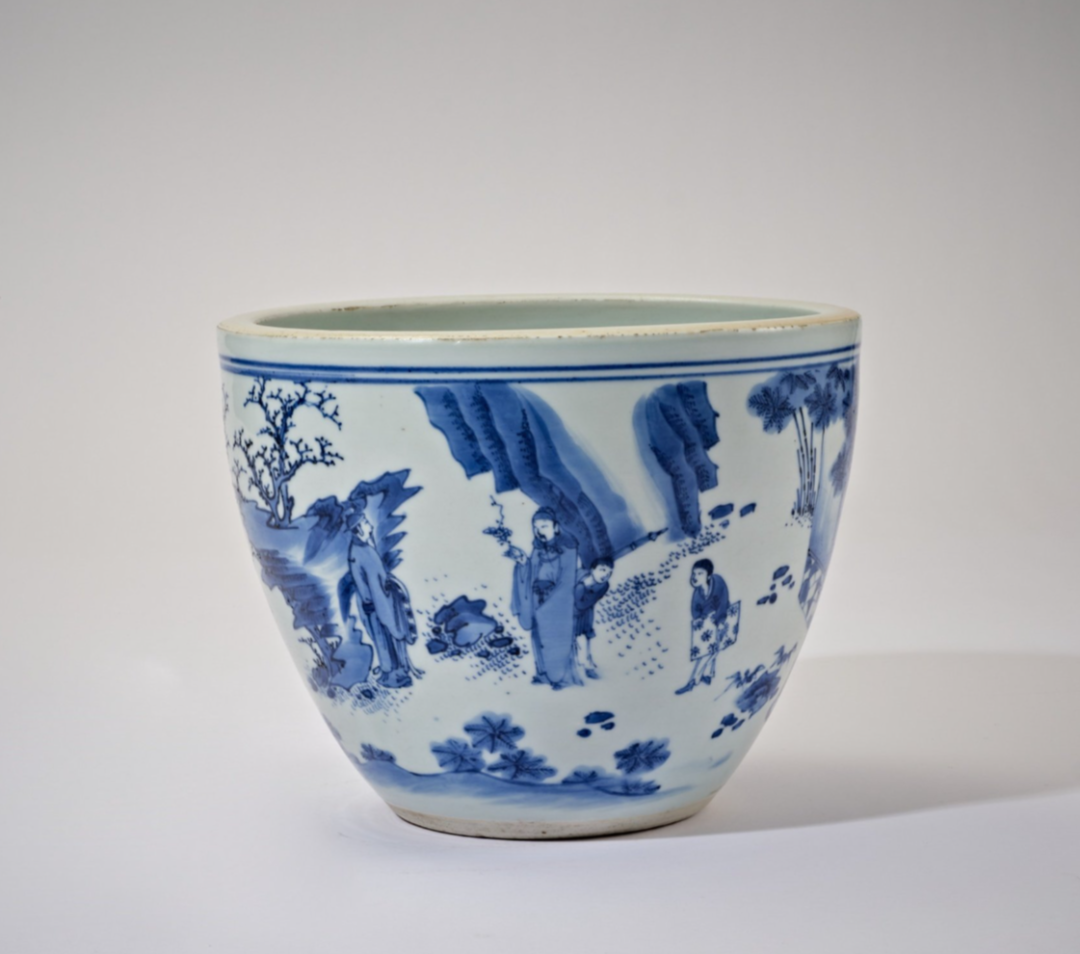 明末清初时期,文学艺术繁荣,瓷器制作展现出全新的时代风貌,题材之特别、内容之丰富,均开一代未有之奇,尤其瓷质文房用具以其多样化的造型、丰富多彩的纹饰而流行一时,卷缸成为文人案头不可或缺之物。而青花一色更为叹绝,所用之浙料色鲜亮迷人,故所烧之青花器皿,精美高雅。刊行于崇祯十年的《天工开物》对此赞誉为「上品细料器」。