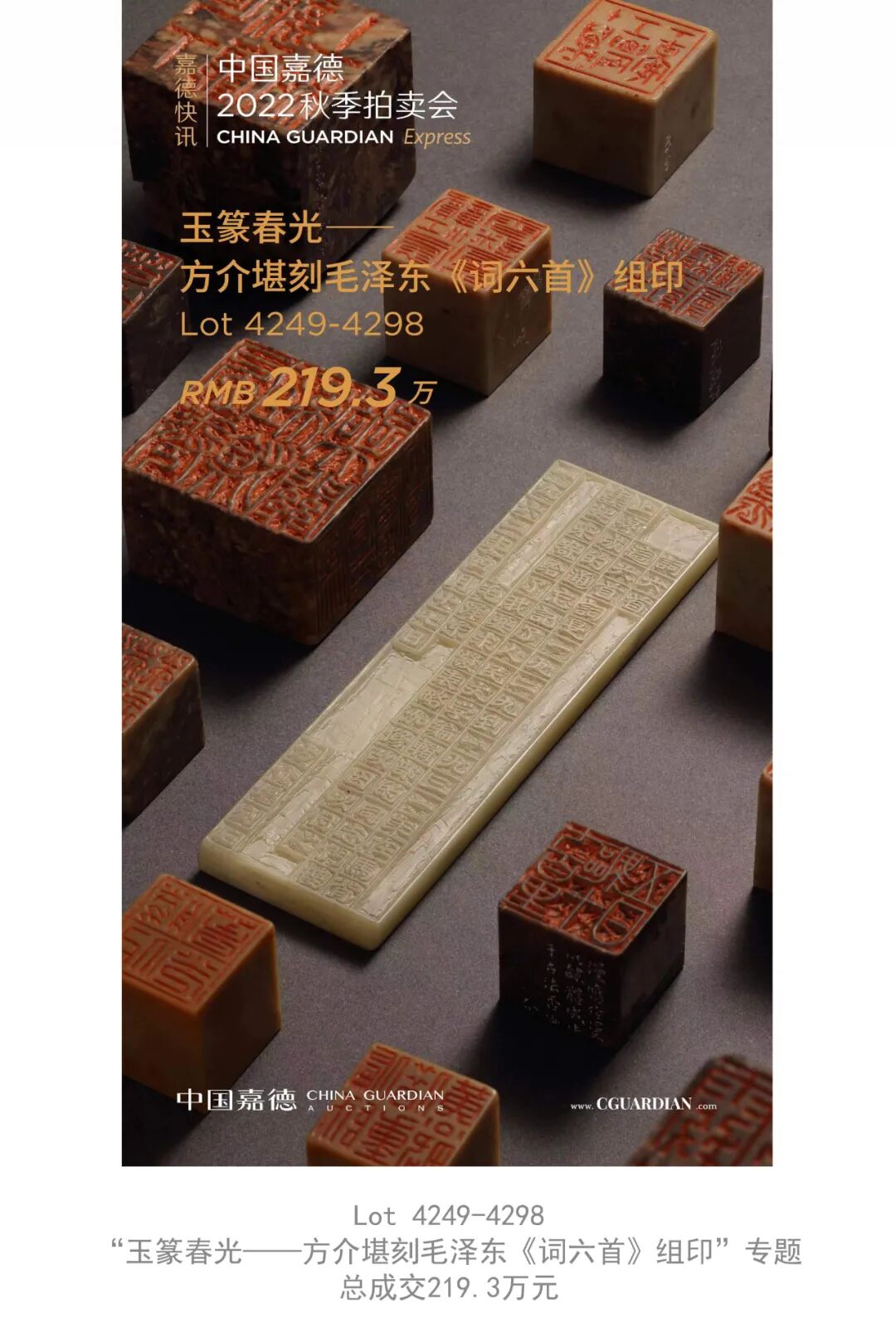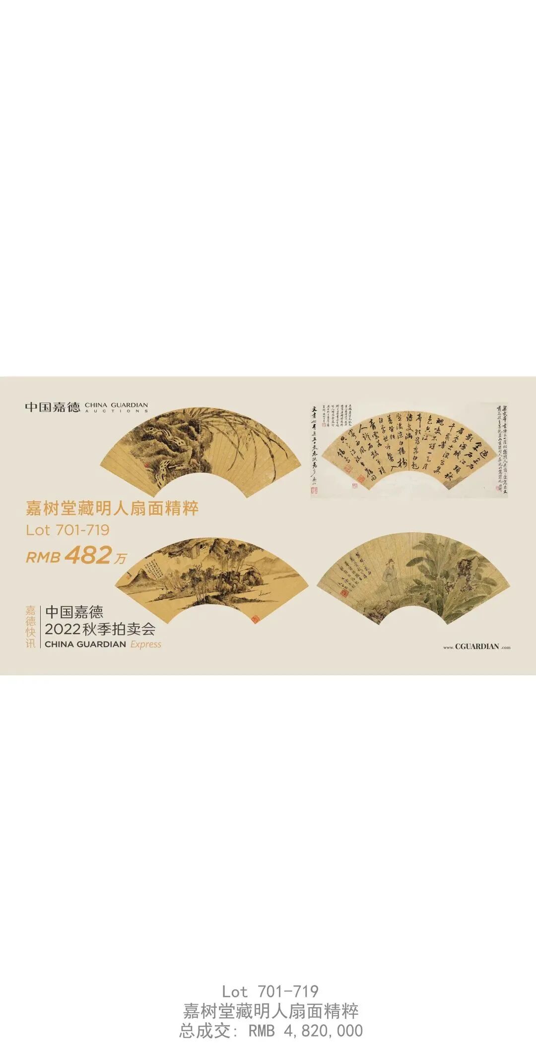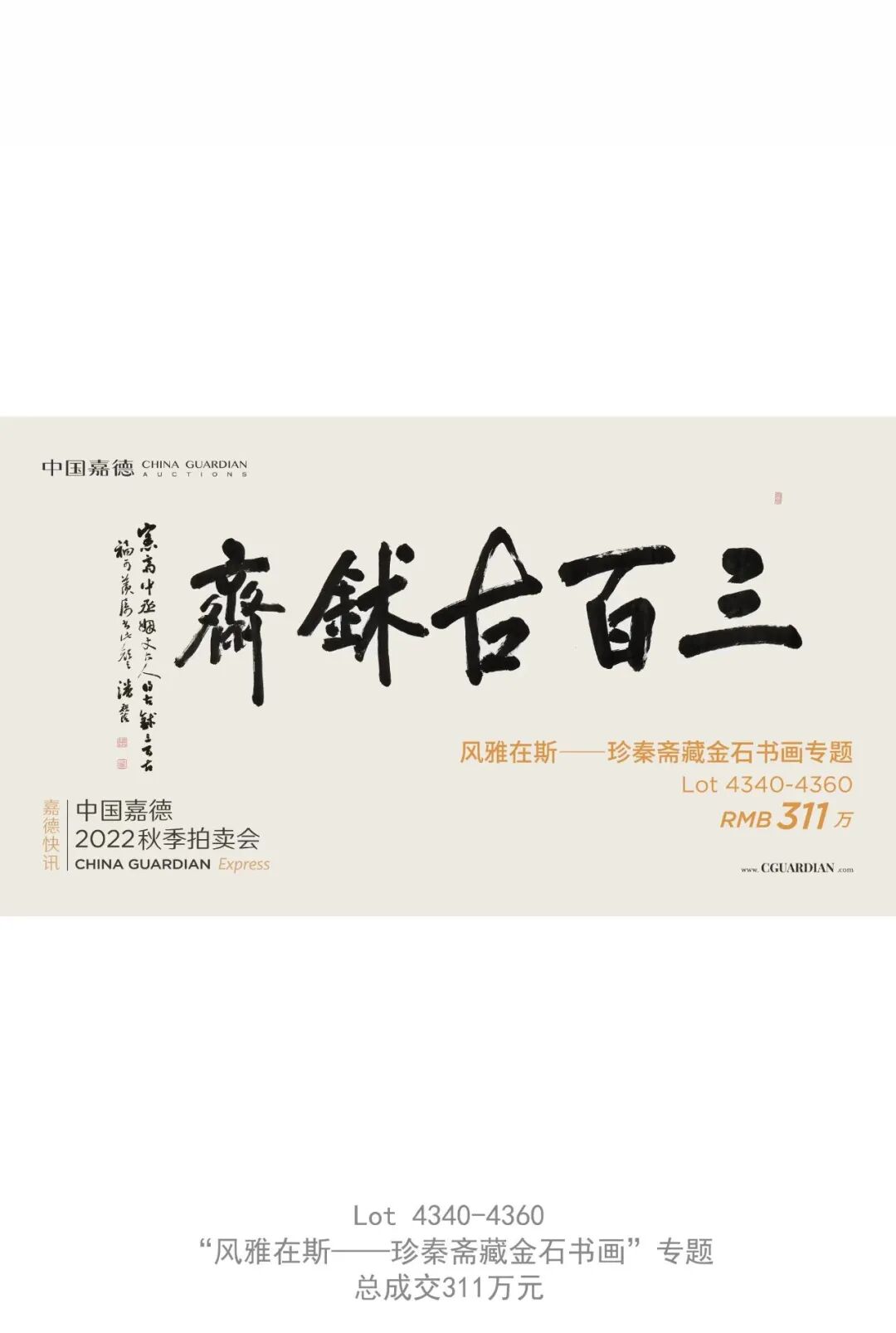 面对前所未有的疫情挑战,中国嘉德以一如既往的高品质拍品和细致周到的服务,完成了一次几乎不可能完成的拍卖会,成绩来之不易。感恩广大藏家朋友坚定的支持和信任,感恩嘉德员工默默的坚守和奉献,感恩来自四面八方的关注和鼓励。正是因为你们,中国嘉德才能傲雪凌霜,燃情如火,穿越寒冬,让暖意抵达每一位藏家,为拍卖市场送来春的消息。