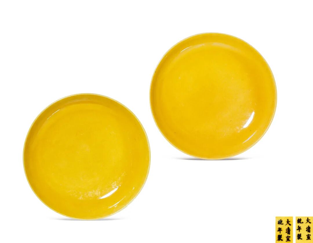 直径15.5cm;高6.6cm黄釉系有浇黄、柠檬黄之分。浇黄釉是以氧化铁为呈色剂在氧化气氛中烧成的中温釉 创烧于明宣德,坚实牢固, 不易剥落,且呈色鲜润娇嫩恰如鸡油故又称之娇黄 、 鸡油黄 。因“黄”与“皇”谐音,故明清两代烧制以内纯皇釉之器为帝后专用。柠檬黄又称淡黄,乃雍正窑创制,是一种比浇黄更为浅的中温釉,属雍正窑单色釉名贵品种。本轮秋拍,便有一对“清雍正黄釉仰钟杯”值得关注。