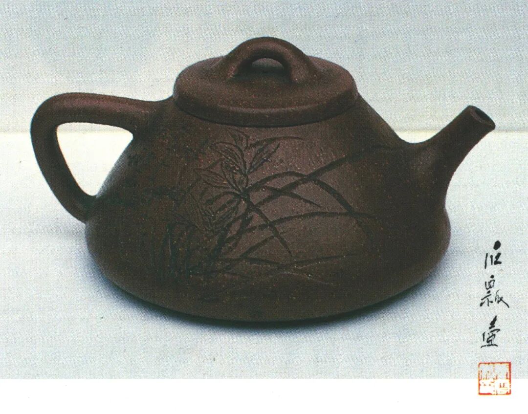 比起大石斋中的百余件紫砂壶,《紫砂壶鉴赏》中出现的唐云自藏并不算多,可见唐云先生对出版物中出现的砂壶有过高标准的筛选。从精心筛选后的瞿壶来看,唐云收藏瞿壶的取向可谓既专一又博爱。四件中有三件器型相同,都是久负盛名的“子冶石瓢”,而在书画刻绘上就有了差异化,梅兰竹各一件,还有一件则是以金石味十足的大片铭文为主,他就如集邮一般将各个刻绘主题的精品瞿壶收入囊中,同时以这四把自藏、自选、自出版的子冶壶全面地向我们展示了他的收藏品味和对瞿子冶砂壶艺术的欣赏。唐云或许不像古往今来的紫砂玩家一样,认为瞿子冶的竹绘最佳、刻竹的瞿壶最有收藏价值,而是像他自己评判的一样,“瞿子冶的画到了壶上特别有文人气息,而且工艺和壶型糅合在一起,”所以画梅、画兰的瞿壶在唐云眼里一样值得珍藏细品,甚至比起市场上更多见的竹刻瞿壶,梅兰主题的壶相对罕见,收藏难度可能更大。