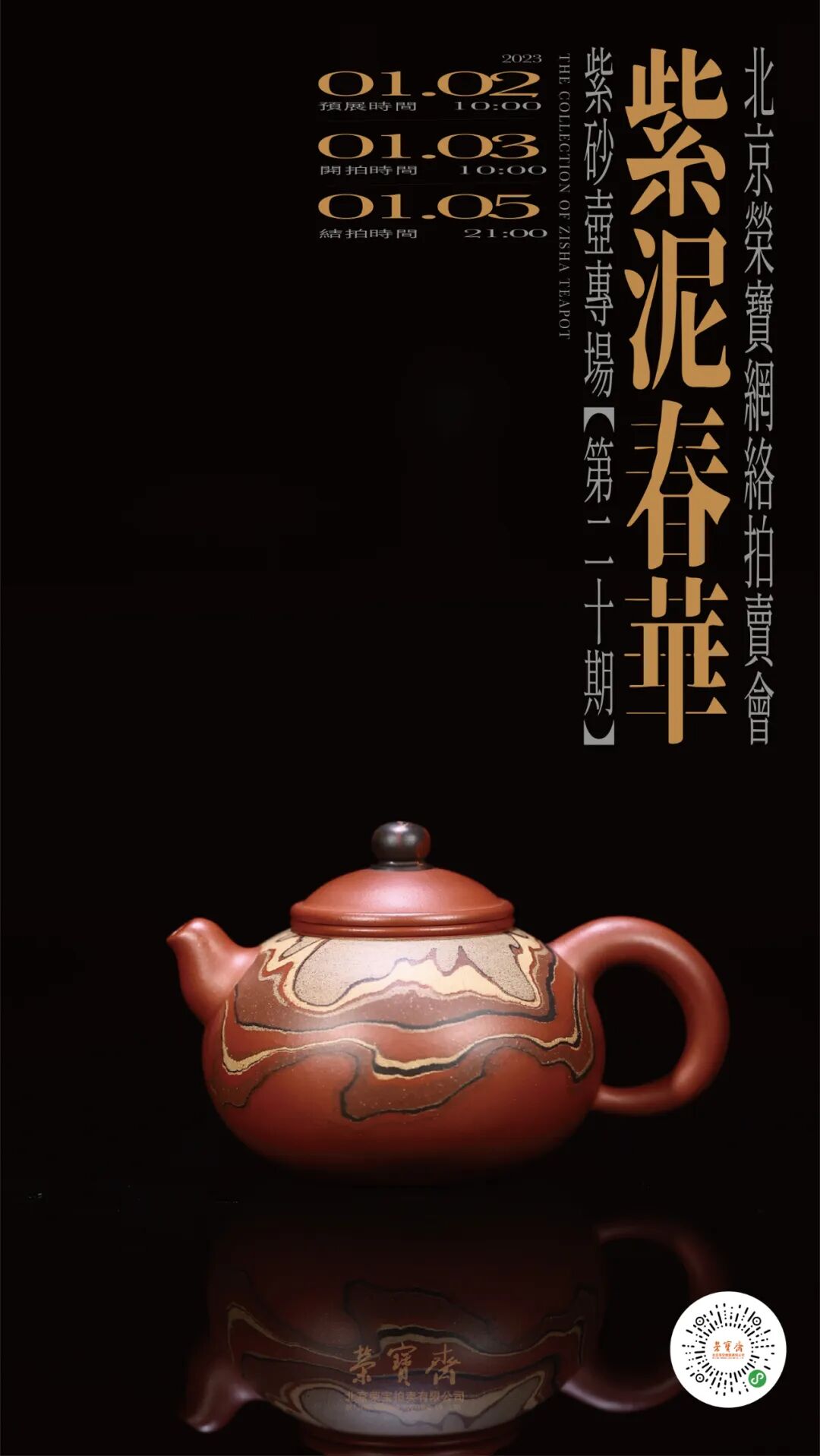 北京荣宝——紫泥春华紫砂壶专场网络拍卖会(第二十期)将于1月2日10:00-1月3日10:00开启线上预展,并于1月3日10:00开拍,1月5日21:00结拍。