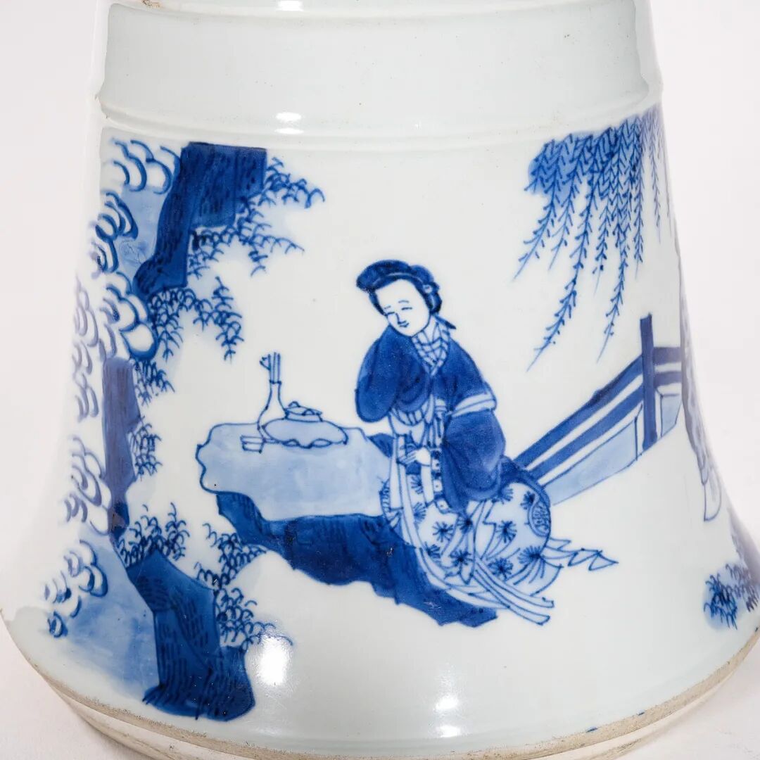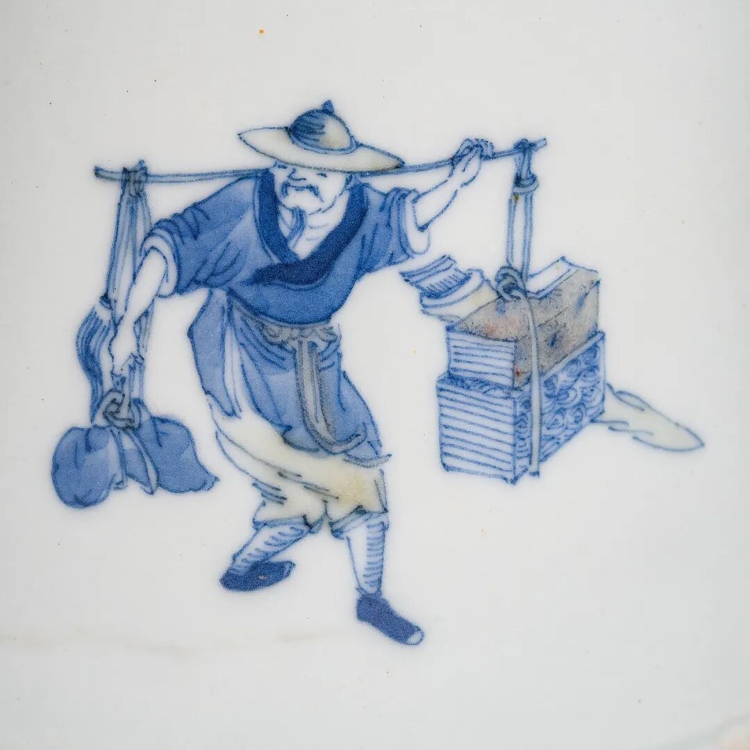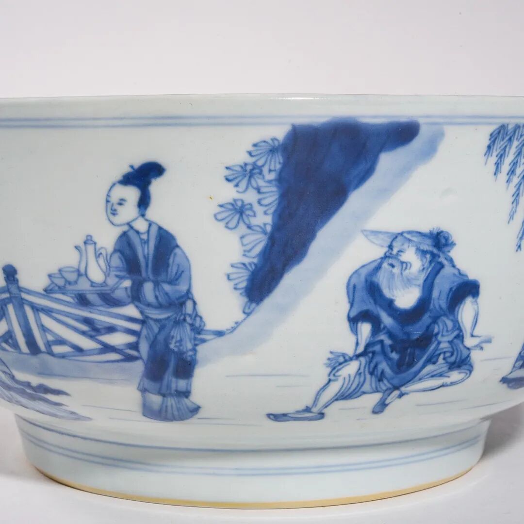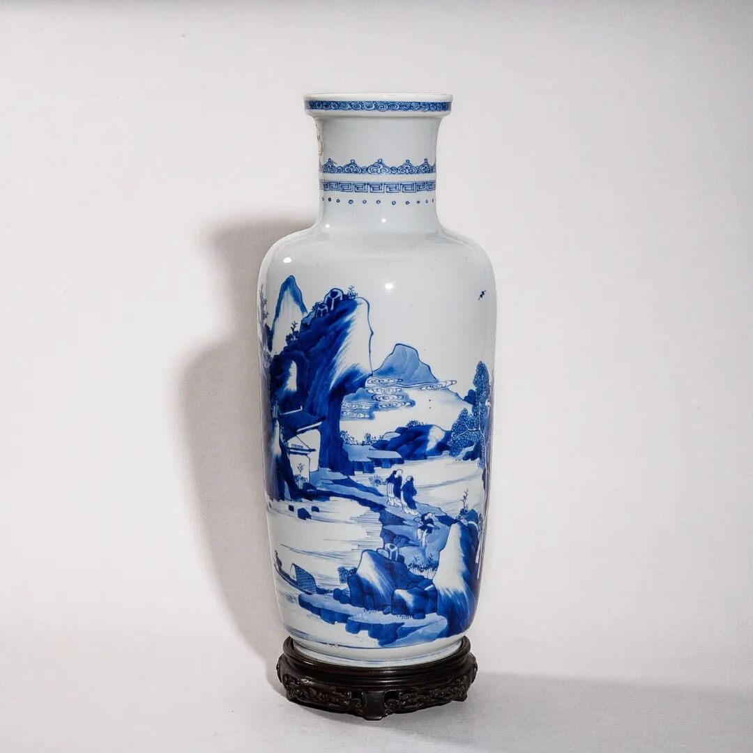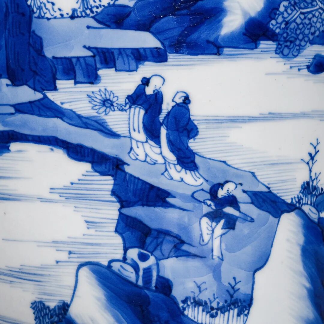 得益于青花钴料提纯技术的发展,在许多明末清初点景人物的表现当中,都运用青花钴料的浓淡变化,表现出人物和山水的特征。这种艺术表现形式被称为“墨分五色”,也正是如此,此时的青花瓷画能够表现得壮阔大气,犹以大件(如此康熙棒槌瓶)为甚。