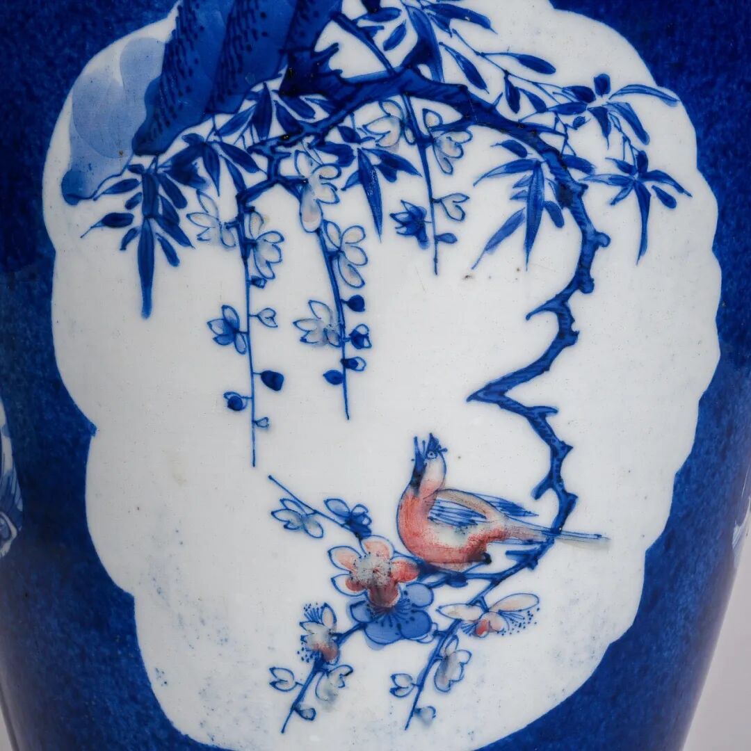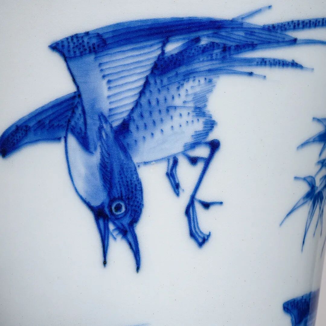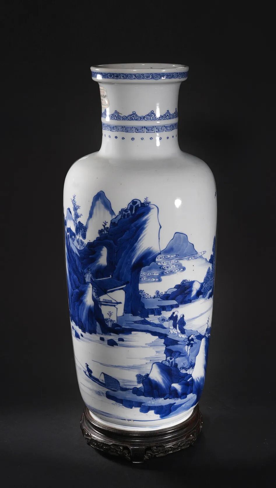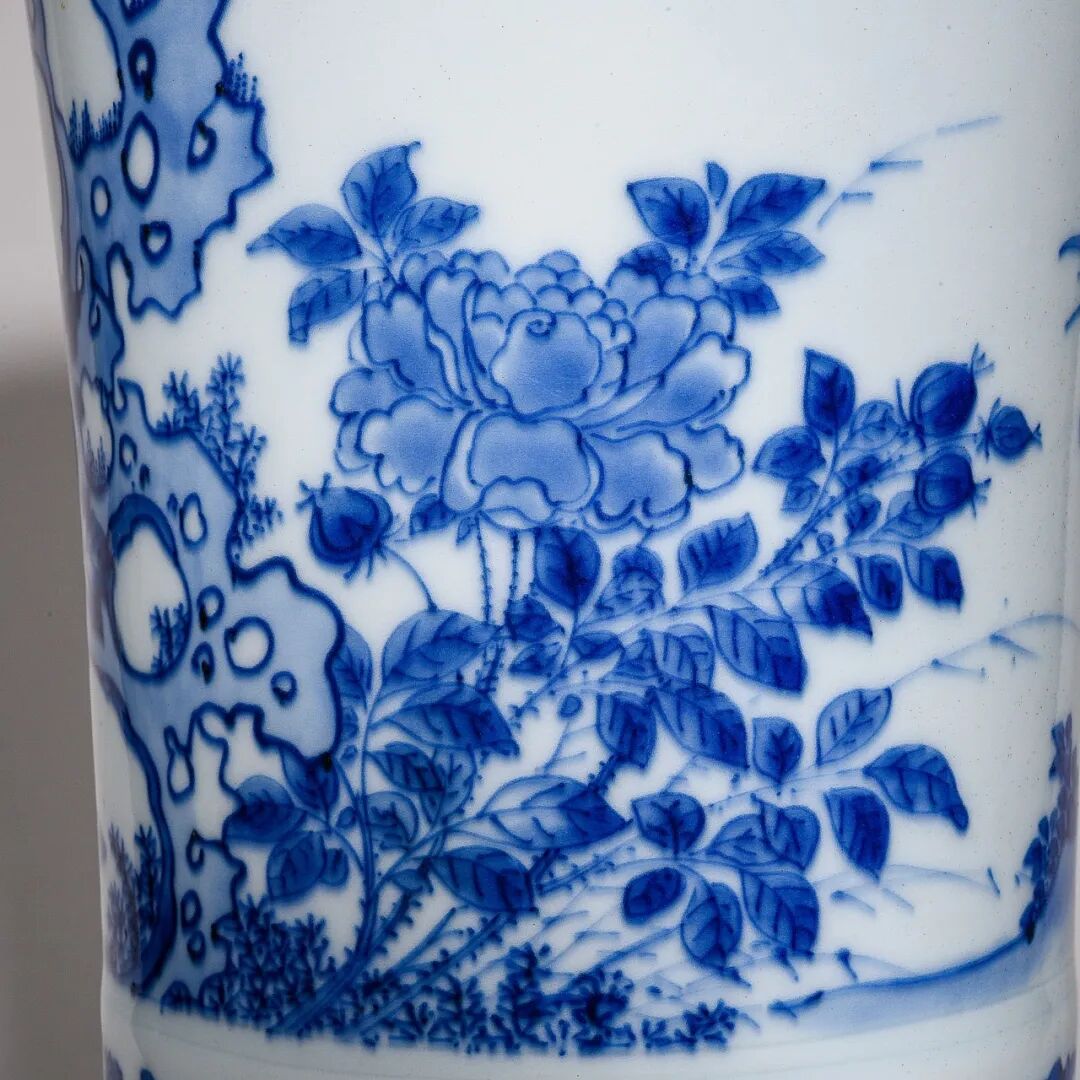 得益于青花钴料提纯技术的发展,在许多明末清初点景人物的表现当中,都运用青花钴料的浓淡变化,表现出人物和山水的特征。这种艺术表现形式被称为“墨分五色”,也正是如此,此时的青花瓷画能够表现得壮阔大气,犹以大件(如此康熙棒槌瓶)为甚。