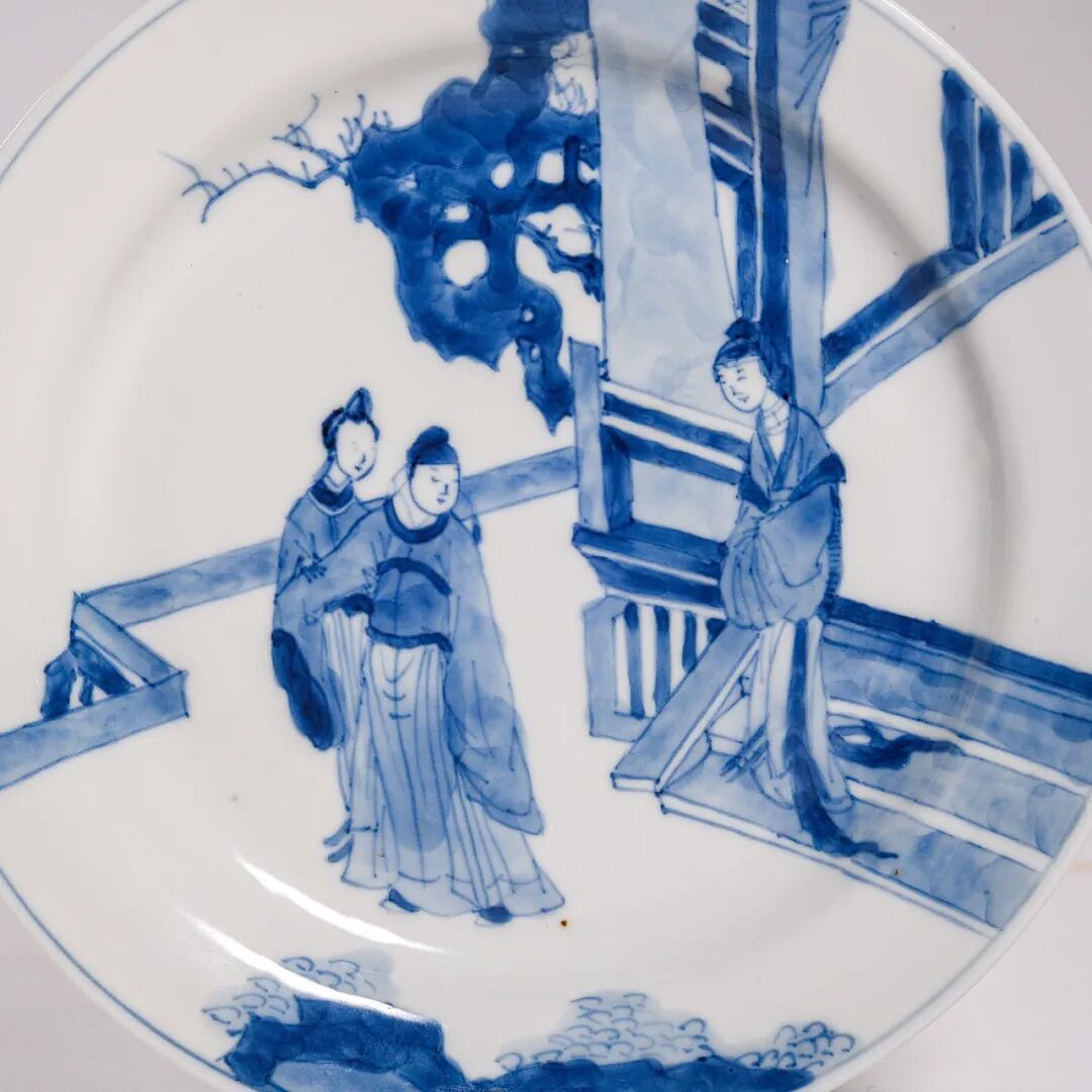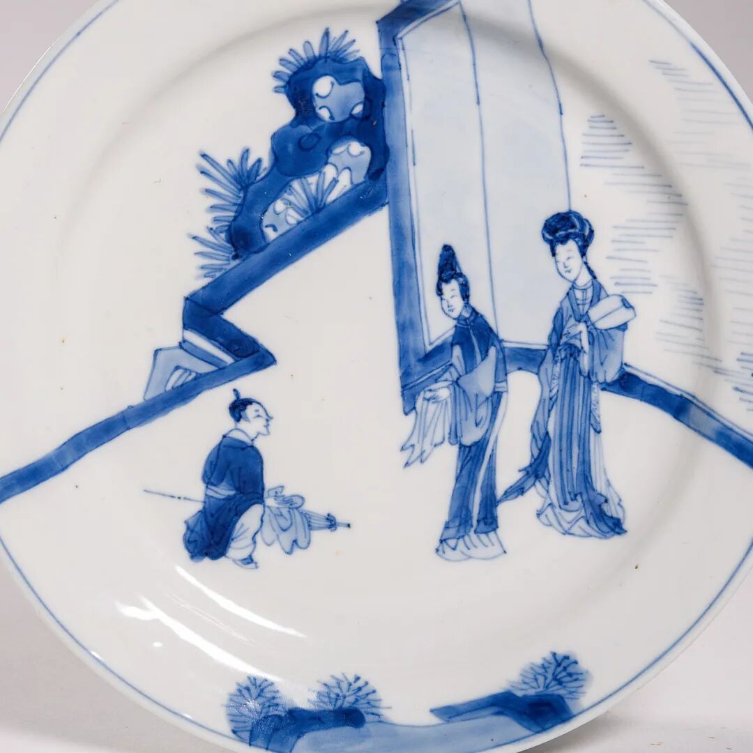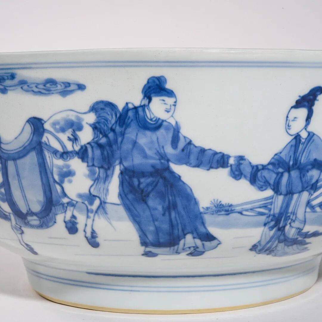 同时随着商品经济的不断发展,市民文化的蓬勃兴起,印刷技术的不断提升,以及资本主义萌芽在手工业的渗透,晚明的版画呈现出一派崭新的风貌及强大的影响力,这种影响力延续到了清初,使得明末清初的版刻在其社会动乱时期依旧保持强劲的生命力。明末清初的版画与画谱无疑为瓷绘工匠提供了摹本,并且影响了该时期的青花和五彩瓷绘。比如这幅青花“游山图”中的文人运用简洁的面将人物概括为头部和身体两部分,就是受到当时如《芥子园画传》等的影响。