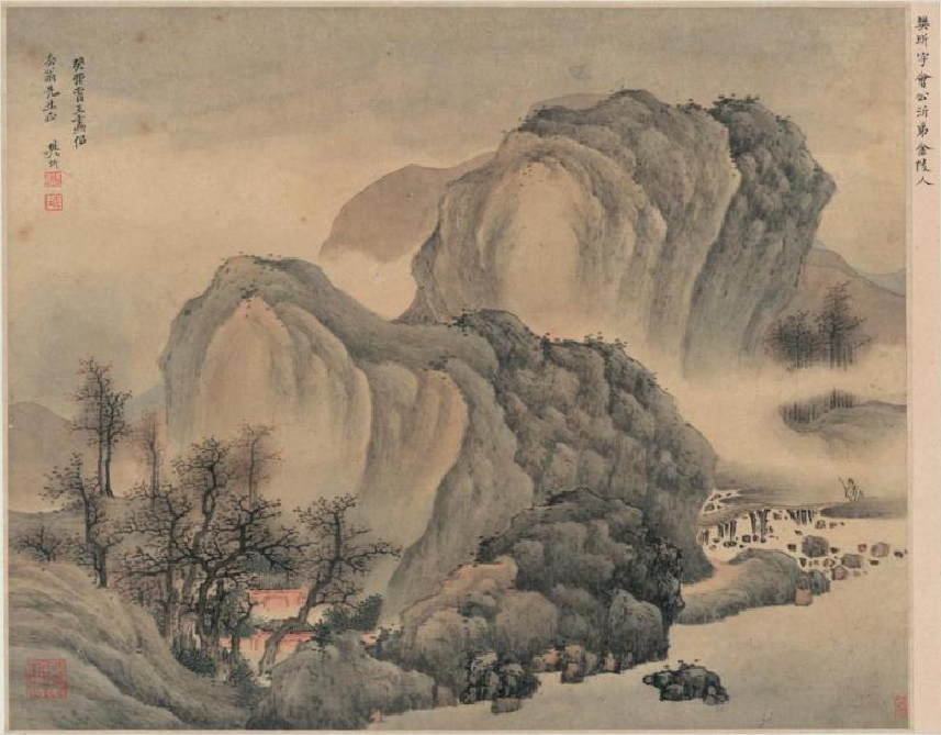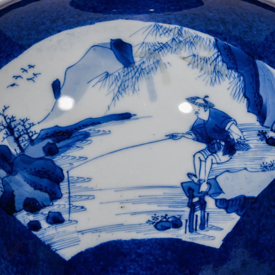 绘画细腻入微,山石层层铺叠,由远及近排列得当,绘以皴擦,阴阳相背,山石立体感十足,这种主题受到同时期的人文画影响较大,如陈洪绶的山水、花鸟画意等,此时期青花山水纹饰整体画风的意蕴也与该时期文人绘画相似。