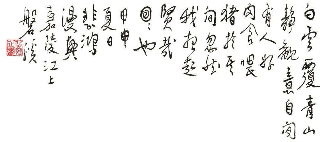 【题识】白云覆青山,静观意自闲。有人好肉食,喂猪于其间。忽然我想起,贤哉回回也。甲申夏日,悲鸿漫兴嘉陵江上盘溪。