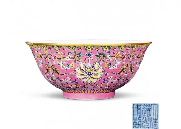 清道光 胭脂粉地粉彩“连年有余”“五福捧寿”纹大碗