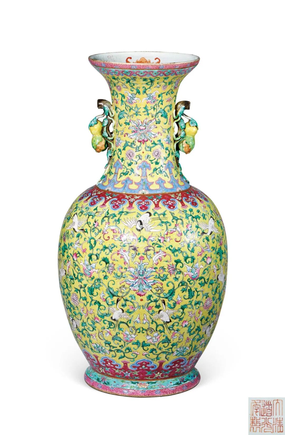 清道光 黄地轧道粉彩鹤寿连绵双耳大瓶