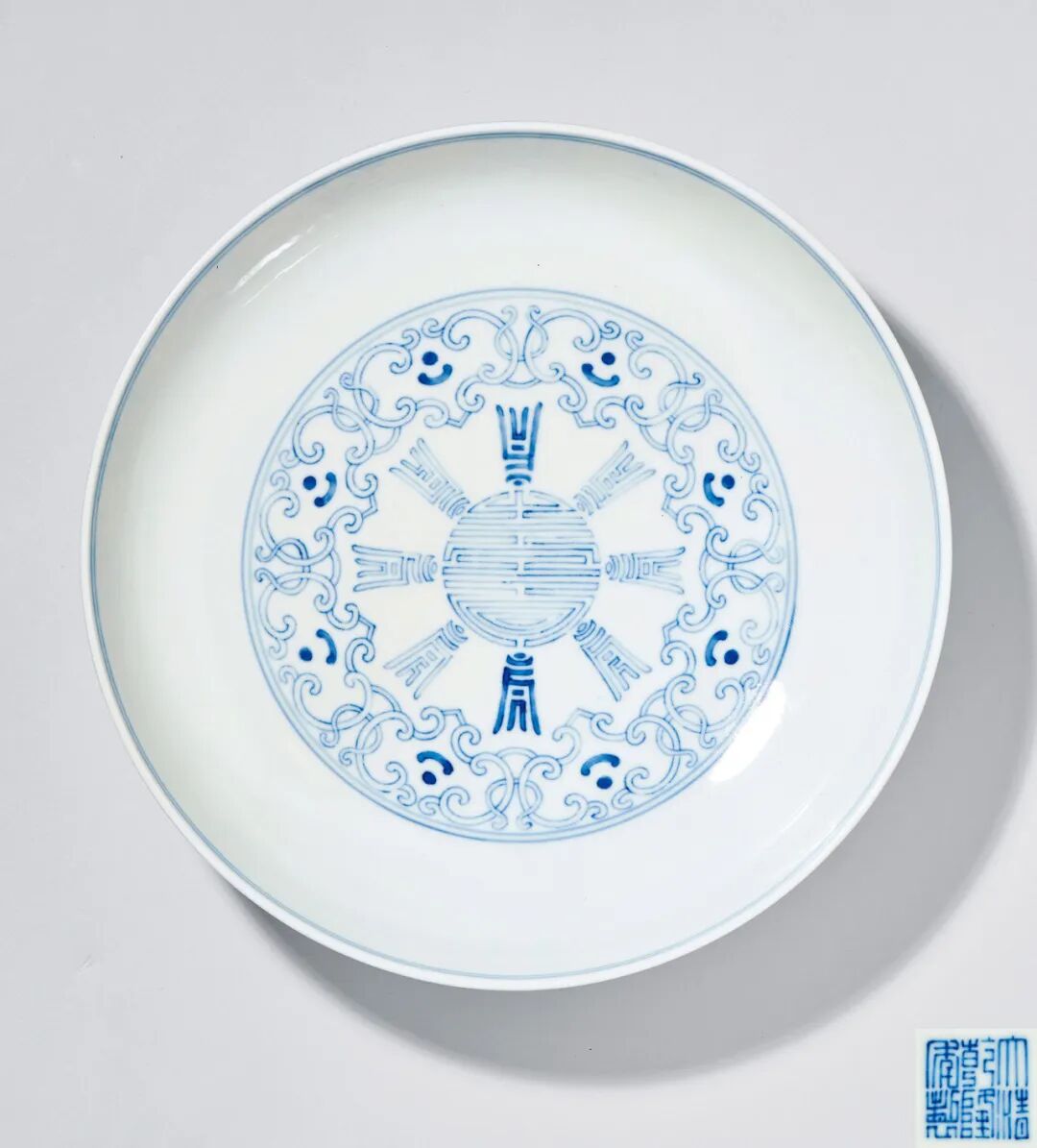 清乾隆 青花淡描贯套如意捧寿纹盘