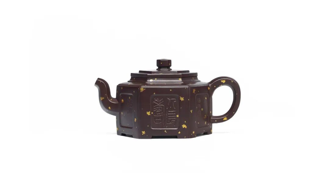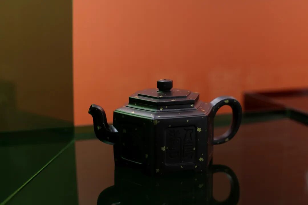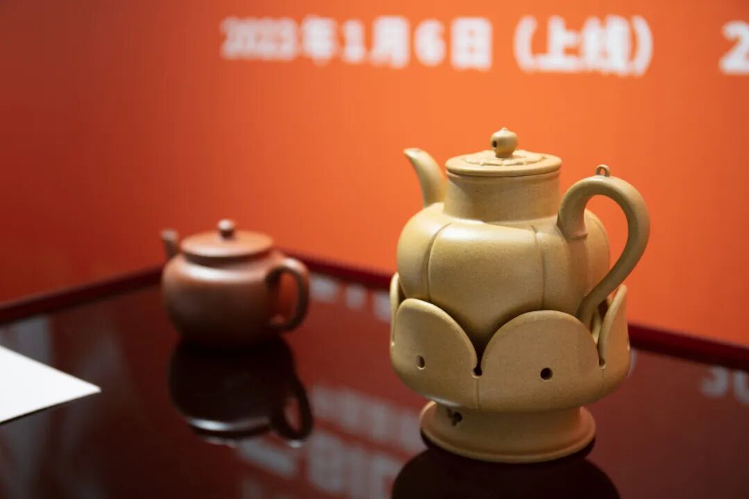 “礼赞新时代——紫砂新青年2023邀请展”展览现场杨涛作品《和瑞六方》设计理念源于明式雕刻窗花工艺,壶身为六片双层泥片全手工相接而成,之后再切出窗花,辅以中国陶瓷艺术大师王亚平刻绘:“大富贵,人长寿。”每个壶面相接处以抽角的形式彰显细节的别致。烧制完成后施以洒金工艺,凸显整壶富贵大气之感。