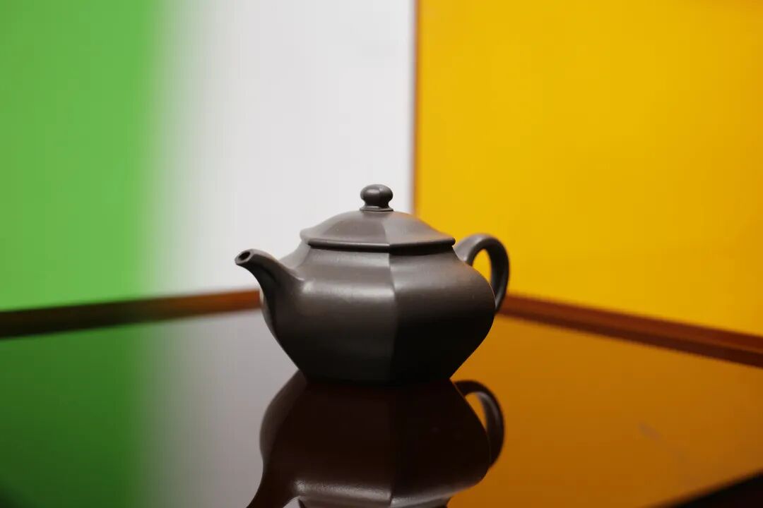 “礼赞新时代——紫砂新青年2023邀请展”展览现场蒋程思博采众长,尝试方器制作,作品《六方思源》是根据几何造型创作而来的紫砂器型,其形体明快挺秀,具有阳刚之气,棱角清晰,将方器的几何之美塑造得十分的漂亮,六方亦是经典方器款型,达到了方器“线条流畅,轮廓分明,平稳庄重”的规则要求。此壶以经典器型《藏六方》为原型,精简了壶身线条,整体造型更显秀气,搭配天青紫泥的色泽,适应了当下极简高级感的趋势。虽具方之态,然六方之中隐现圆廓之美。这也是手工成型制壶才会形成的特定张力,使人观之有成熟大气之感。