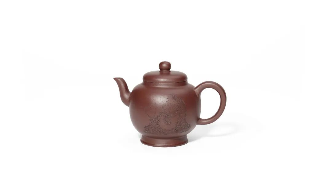 “礼赞新时代——紫砂新青年2023邀请展”展览现场蒋欣含制壶、陶刻兼擅,作品《南州高士》清而不浊,雅而不俗,形似宫灯壶式,以圆润为主,泥色自然质朴,气韵饱满,典雅古朴。壶颈、肩与壶身相融,比例得当,恰到好处地衬托出壶身的修长挺拔。壶流在自然弯曲中,粗细渐变,力度与柔美,结合得恰到好处,巧工灵秀。壶身并刻以一位悠闲拿葫芦饮酒的老者,作为跨时空对于徐稚气质的理解,刀法细致极简,所刻内容,用线十分节制,宁少勿多,干净却不失灵气,与壶体相呼应,呈现那种不惹眼,不凑热闹,欣然于造化之中的旷达。作者借物表达自然之道,文人之气。