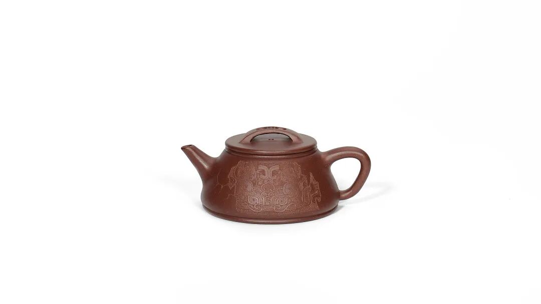 “礼赞新时代——紫砂新青年2023邀请展”展览现场邹杨作品《瓦瓢》是在《石瓢》的基础上结合汉代瓦当改良而成。此壶充分把握住《石瓢》的精髓之处,更融入汉风之韵,壶型新颖,器型古拙典雅,线面简洁明快,壶身仍沿袭古老方法上小下大,使重心下垂,使用起来更稳当。作者功力深厚,处理干净利落 。配合青铜器刻绘,整器端庄大气,气度非凡。