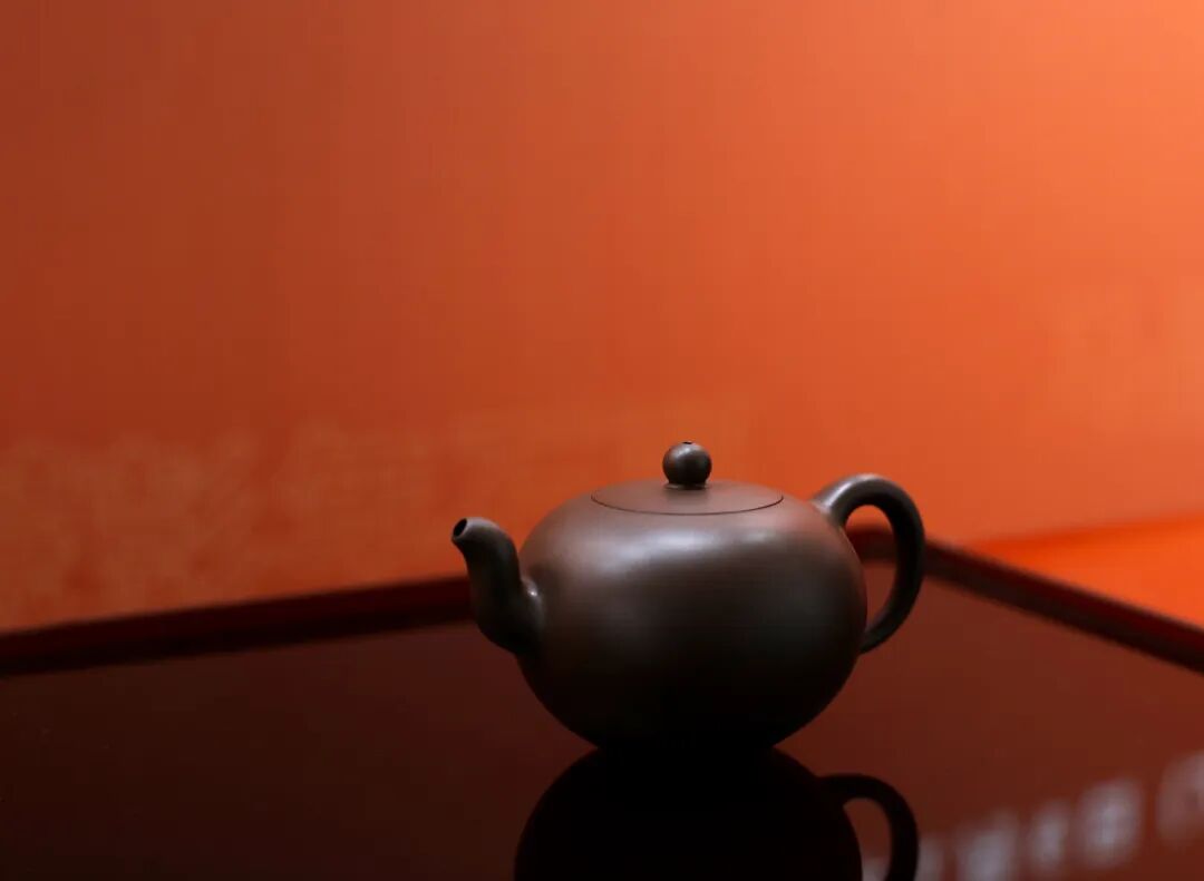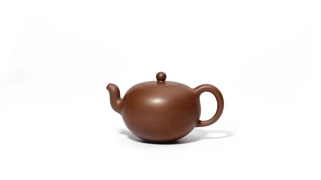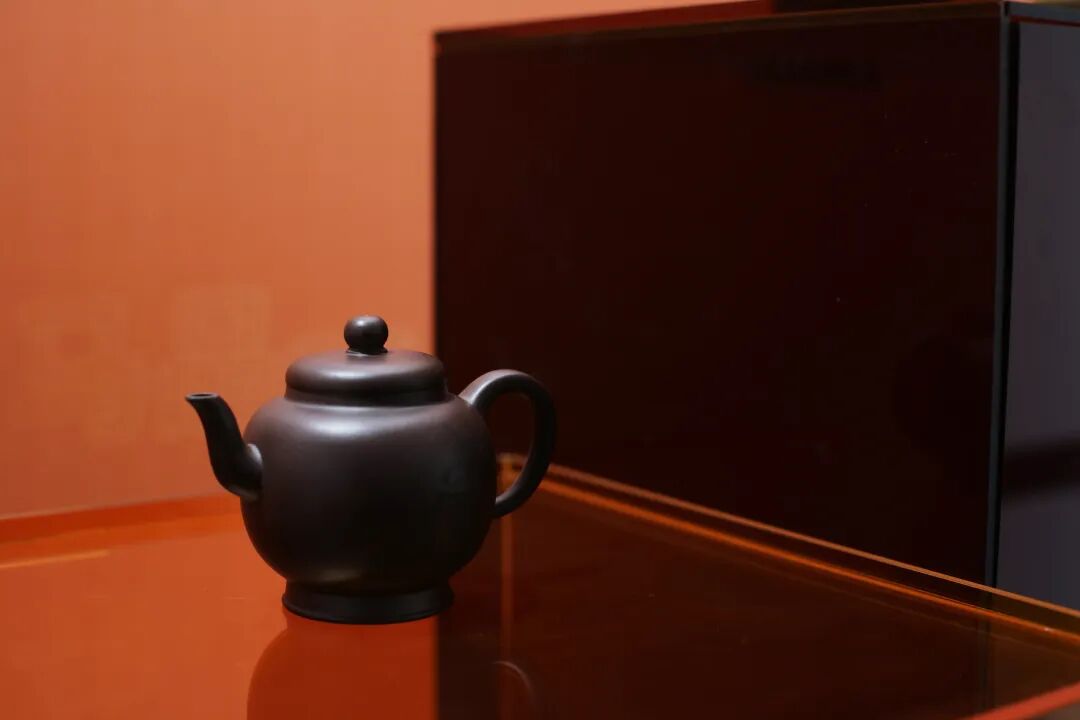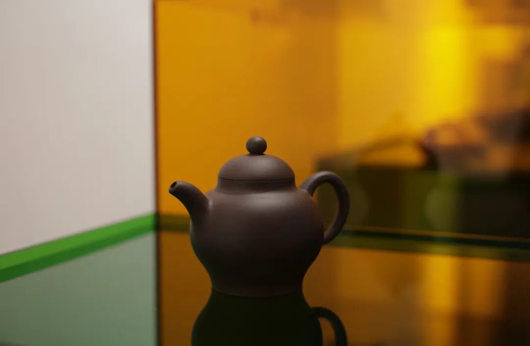 “礼赞新时代——紫砂新青年2023邀请展”展览现场汤重凯擅长传统器型,《一粒珠》饱满细腻,珠圆玉润,壶身一大珠,壶钮一小珠,大珠小珠落玉盘,观之可亲。造型古朴又不乏新意,壶体看似圆硕,薄胎制作,实则轻盈。一弯壶流自然胥出,截盖设计,壶盖与壶身融为一体,圆润之余不显臃肿,整体力度不弱,形成娇憨可爱的气韵。