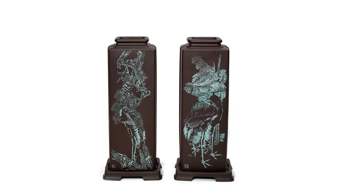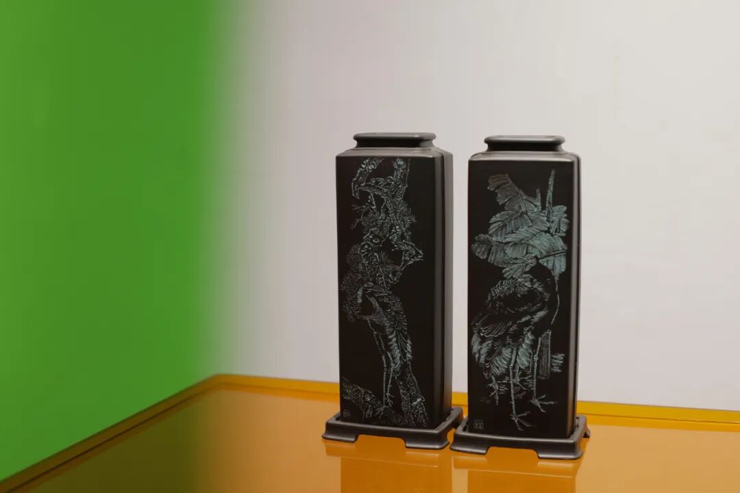 “礼赞新时代——紫砂新青年2023邀请展”展览现场匡吴吉一直专注于陶刻创作,《松龄鹤寿赏瓶套组》瓶体混方,线条挺拔,通体气息禅意浓浓,展现出静态之美。作为生活美学的赏瓶,常追求古朴雅致,稳健静穆的风格,此瓶合乎美学真意,虽由人作,宛若天开。松与鹤,在古人的观念里,皆是吉祥长寿之物。松乃“百木之长”,长青不朽,是长寿和高洁的象征。鹤为“百羽之宗”,祥和优雅,是瑞寿和高贵的象征。瓶体刻绘以“松鹤”入题,刀法老辣,上色文雅,传统功力扎实,充分借鉴古代家具“尽精微、致广大”之美学,形制大方,“刻”与“器”相得益彰,观感舒适。