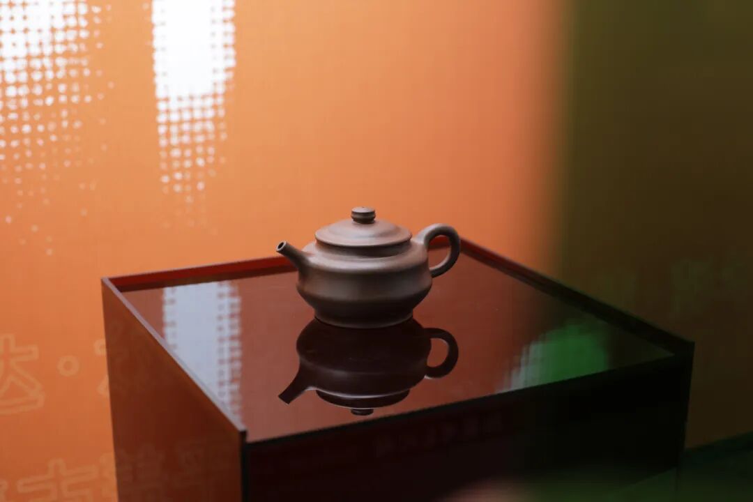 “礼赞新时代——紫砂新青年2023邀请展”展览现场尚赟摹古而制《汲古》,采用刹凹的制作手法使腹部与底更好的过渡,嘴与把简洁明快与壶身搭配相得益彰。