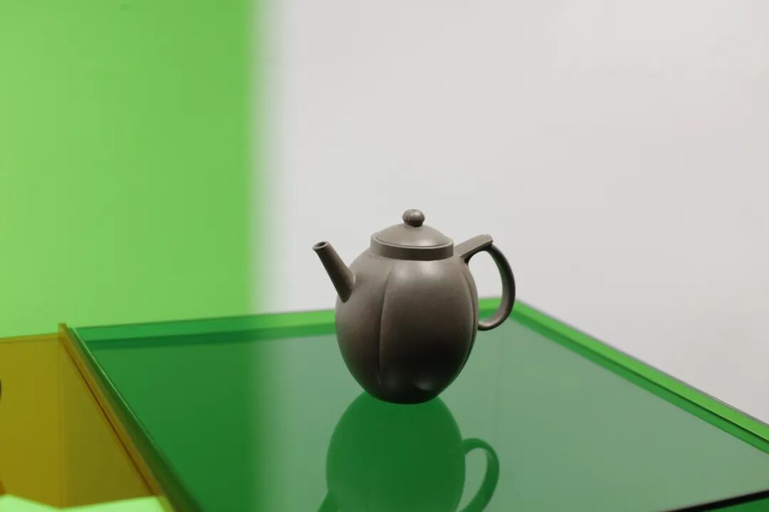 “礼赞新时代——紫砂新青年2023邀请展”展览现场作品《九秋》是马冀在深秋考察上虞越窑遗存后新做,灵感源于唐越窑瓜棱执壶,汲取其中造型要素,再设计表达于紫砂壶体。青段泥色泽醇厚,与壶型高古气息相得益彰。马冀以古求新,作品表现出典雅秀美、端庄轻盈的艺术特征,并适应于现代饮茶生活。陆龟蒙有诗云“九秋风露越窑开,夺得千峰翠色来”,故名《九秋》,以致敬“瓷源”越窑。