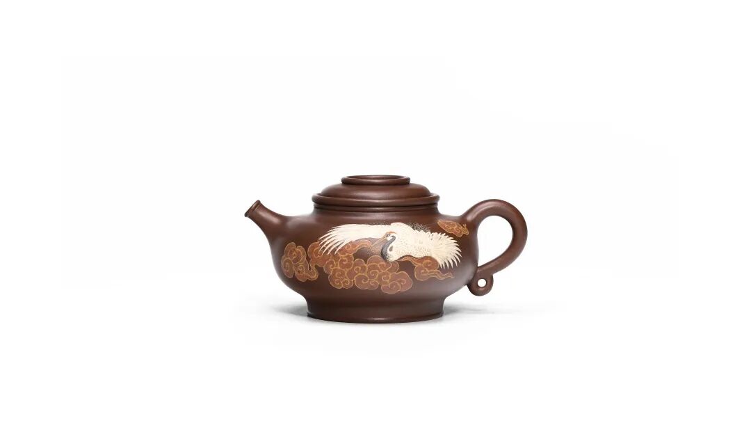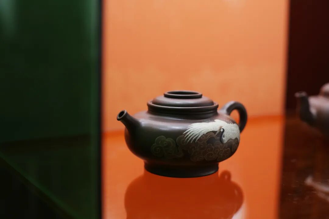 “礼赞新时代——紫砂新青年2023邀请展”展览现场任伟作品《鹤舞云间》表达了人们对生活的美好祝愿,和对长寿的美好愿景。鹤在飘动的浮云中展翅高飞,衬托出吉庆祥和的气氛。张志刚泥绘的云鹤整体构图呈现均衡的感觉,以鹤和云的大小、形状的细微变化来达到构图的平衡。细腻刻画鹤飞舞的姿态,而云则用来填补剩余的空间,使整体的构图更加丰满。构图整体均衡,富有节奏和韵律感。而仙鹤穿梭于云间,形状飘逸,形态潇洒自如。鹤的形态以白色、黑色以及点缀的头部红色色块为主,白鹤的翅尖羽毛根根分明,尾部的羽毛用黑色进行强调,整体色彩均衡,动感足。作者想通过云鹤的装饰,来给予人们一种吉祥的祈愿。