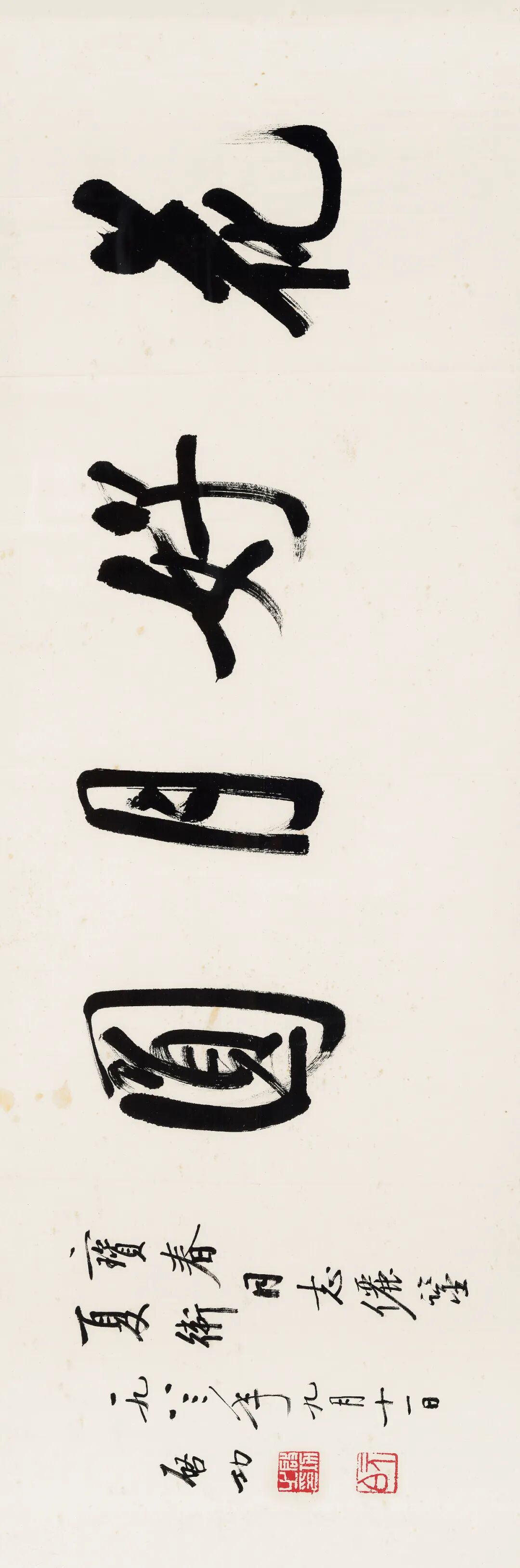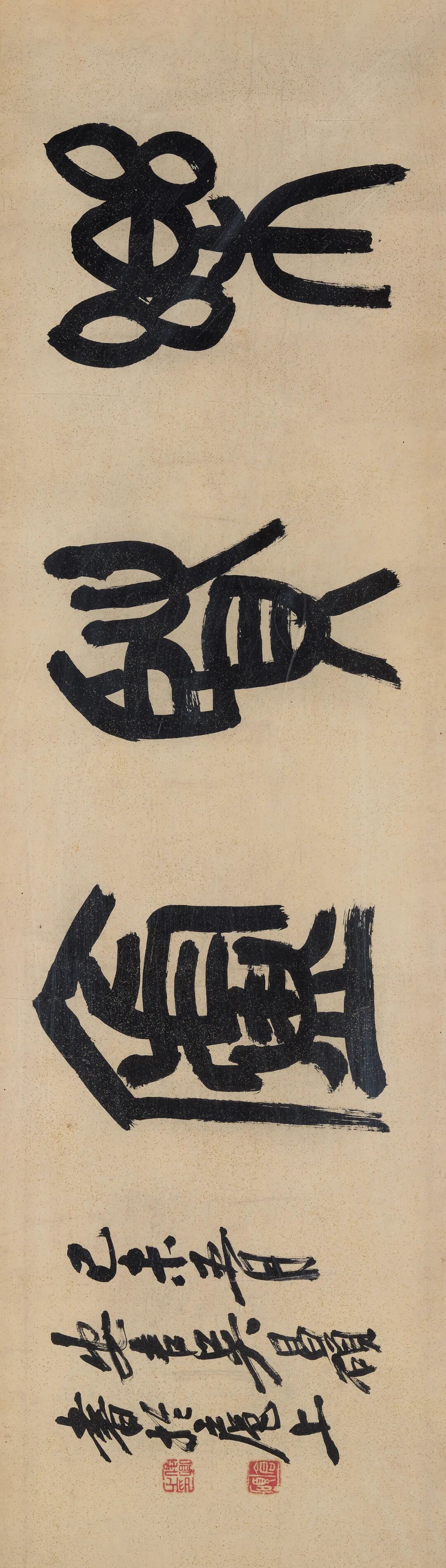 私淑吴缶老亦卓然为一代宗师的齐白石,继吴氏而为二十世纪前半叶书坛巨擘。齐氏早年以匠人法入书画,书法金冬心、何子贞,极窥堂奥,赠朱悟园之《九帅图》即可证之;衰年受朽道人点拨而变法,改弦更张,学吴昌硕以金石切入,根去其佻,又佐以碑法,以何子贞之圆转流利力革康南海肆而不蓄之弊,其后书风遽尔一变,骨法奇崛,取势跌宕,力振沉疴。胡佩衡胡橐也父子旧藏之《行书“小楼残月雪无声”》已见齐氏腕底鬼神,其书歧侧掩映、老辣艰涩,别具风格;1926年为同乡印春所作《篆书“慈云山馆”》则浑穆庄正,大饶宗风。