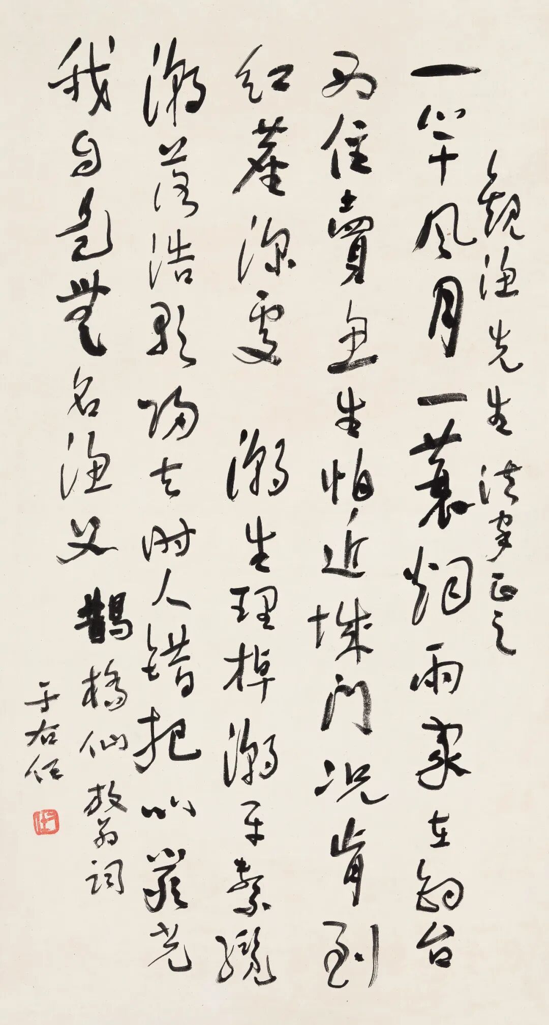 【释文】一竿风月,一蓑烟雨,家在钓台西住。卖鱼生怕近城门,况肯到、红尘深处。潮生理棹,潮平击缆,潮落浩歌归去。时人错把比严光,我自是、无名渔父。鹊桥仙放翁词。观渔先生法家正之,于右任。