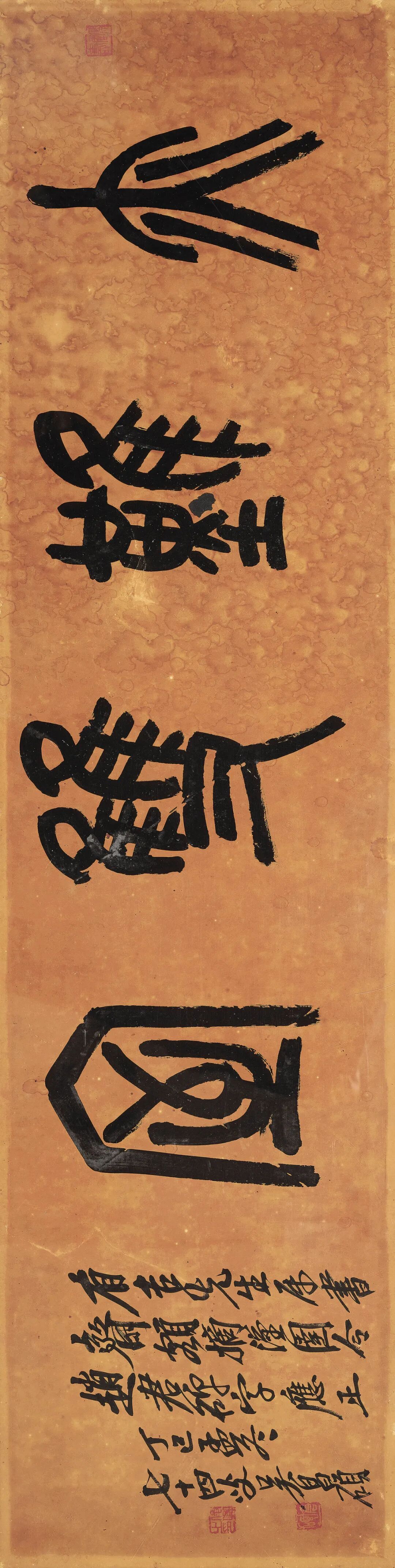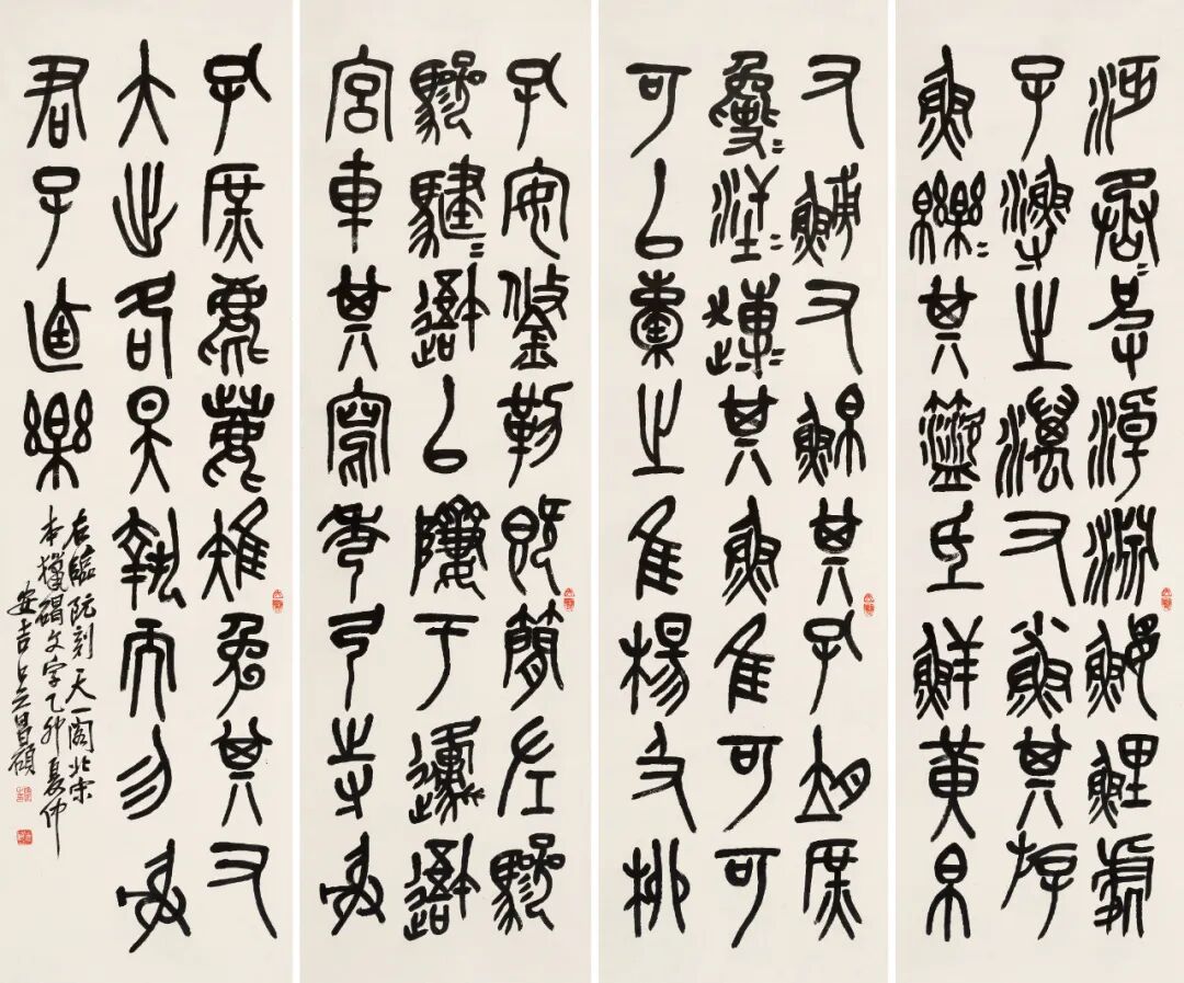乾嘉以来,重考据、训诂的汉学大兴,连带着金石学也开始大发展。久守儒业的吴昌硕亦在前辈领袖任伯年故去后开始了对自己笔墨的革命。大致在五十岁左右,他开始尝试将金石气引入书画,遍临古金石文字,如石鼓文、汉砖刻、青铜铭等等,至辛亥前后已告大成,所作浑然鼓荡,铿铿然有金石声,一变晚清以降落魄文人特具之纤细萎靡雕琢习气,其后署款几弃用“俊卿”。《节书石鼓文四屏》系其大成之后复临,尤见所参己意。又1917年作赠日本时驻上海总领事有吉明之《篆书“亦难双室”》、1918年作赠李鸿章侄孙李国松之《篆书八言联》、1919年作《篆书“乐贤庐”》均为篆书,正可由是窥得缶道人于此用力之变化与化境之锤炼。