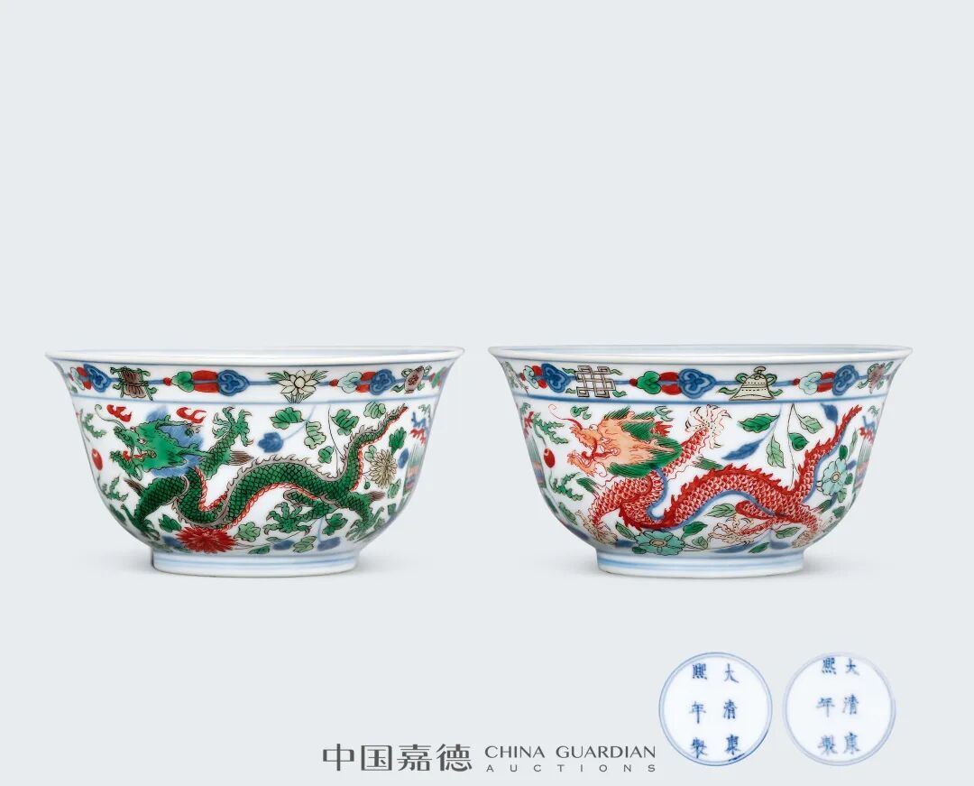 细看这对清康熙的龙凤碗,上层近口沿处还绘有法螺、法轮、宝伞、白盖、莲花、宝瓶、金鱼、盘长八种宝物,称“八宝”,亦称“八吉祥”。八吉祥是佛教传说中的宝物,由象征吉祥的八种法器组成。