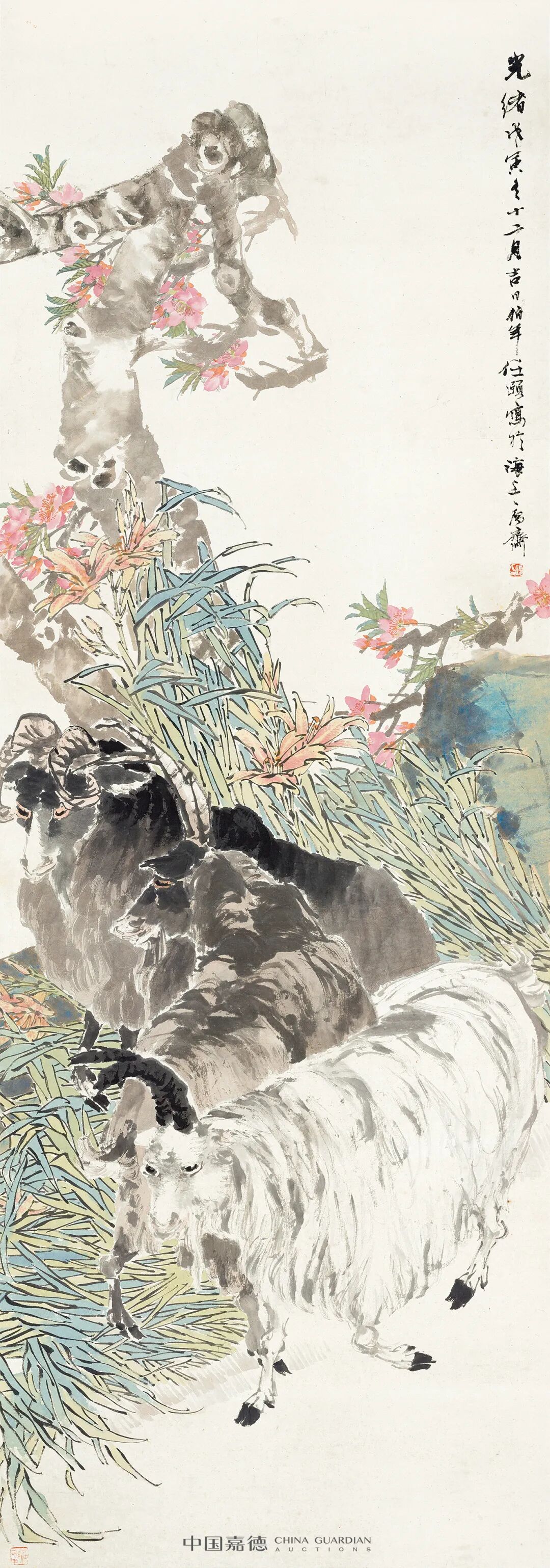古人认为十月为坤卦,为纯阴之象;十一月为复卦,一阳生于下;十二月为临卦,二阳生于下;正月为泰卦,三阳生于下,冬去春来,阴消阳长,有吉亨之象,故称“三阳开泰”。古时“羊” 与“阳”相通,可假借,于是三只羊象征三阳,成了有吉祥的寓意图案。有时也会在三羊之上画一太阳。任伯年先生的这幅《三羊开泰》,桃萱草、三羊、红日,祥物种种都在合适的位置上彼此勾连成气,满纸的吉祥便连成了片。